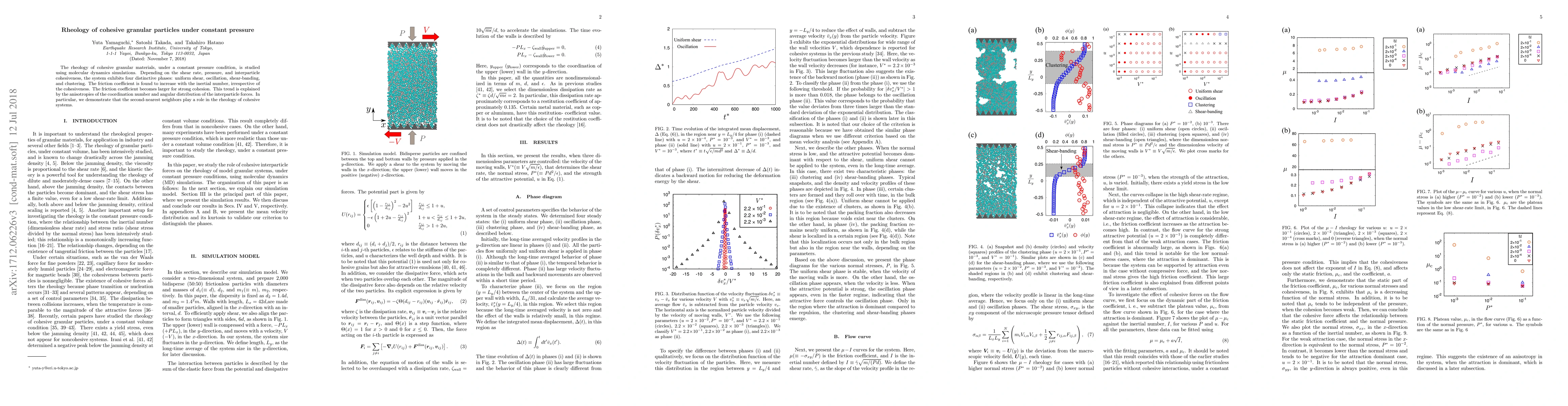 This study uses molecular dynamics simulations to explore the rheology of cohesive granular materials under constant pressure, identifying four phases: uniform shear, oscillation, shear-banding, and clustering. The friction coefficient increases with the inertial number and is higher for stronger cohesion, attributed to anisotropies in coordination number and interparticle force distribution, with second-nearest neighbors influencing the system's behavior.