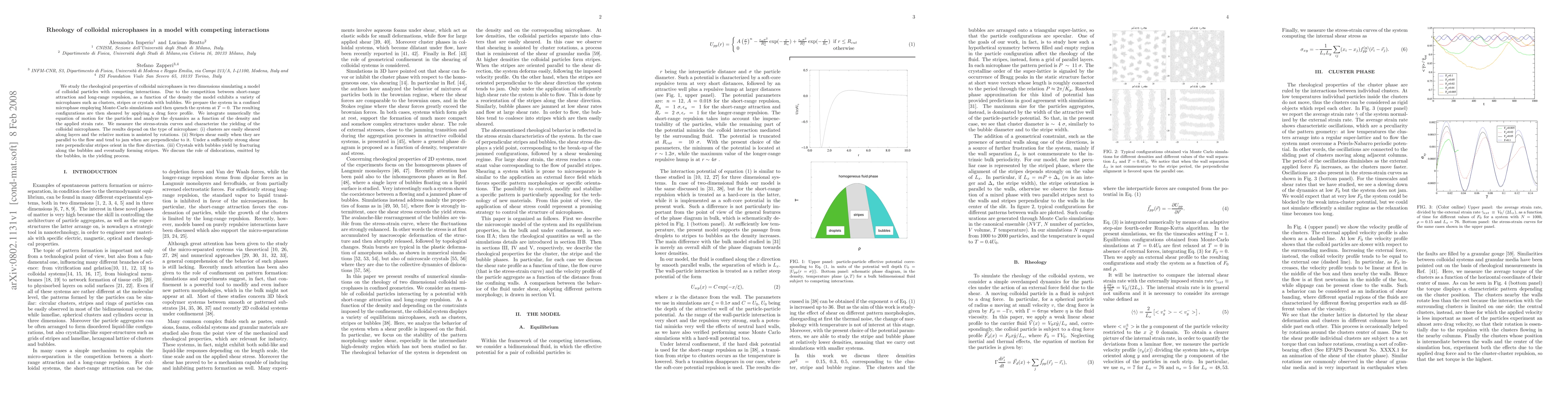 This paper investigates the rheological properties of colloidal microphases in two dimensions under competing interactions, revealing distinct yielding behaviors for clusters, stripes, and crystals with bubbles. The study finds that clusters and aligned stripes shear easily, while crystals with bubbles yield by fracturing along bubbles, highlighting the role of dislocations.