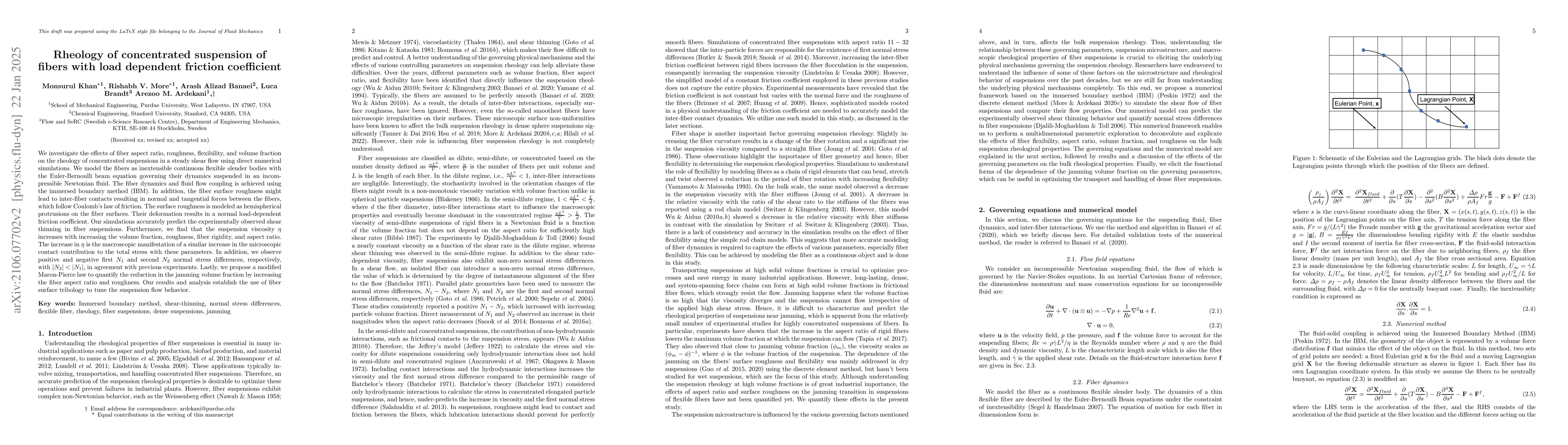 This paper numerically investigates the rheology of concentrated suspensions of flexible fibers, focusing on the effects of fiber aspect ratio, roughness, and flow inertia. It finds that contact stresses and load-dependent friction significantly influence suspension viscosity and behavior, predicting a decreasing jamming volume fraction with higher fiber aspect ratio and roughness.