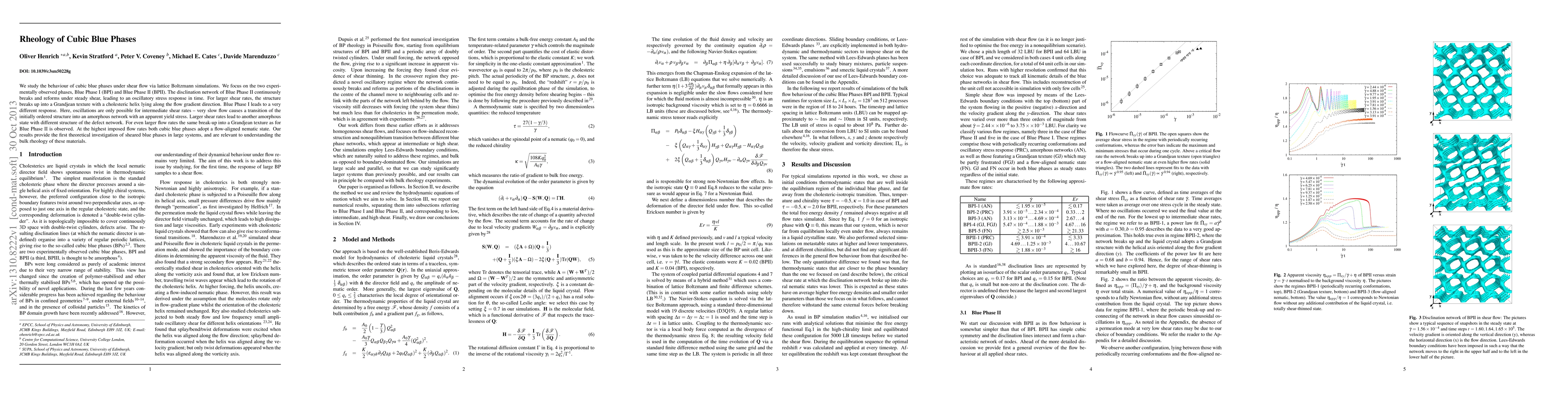 This study uses lattice Boltzmann simulations to investigate the rheological behavior of cubic blue phases I and II under shear flow. Blue Phase II exhibits oscillatory stress responses due to continuous disclination network reformation, while Blue Phase I transitions through ordered, amorphous, and Grandjean texture states under varying shear rates.