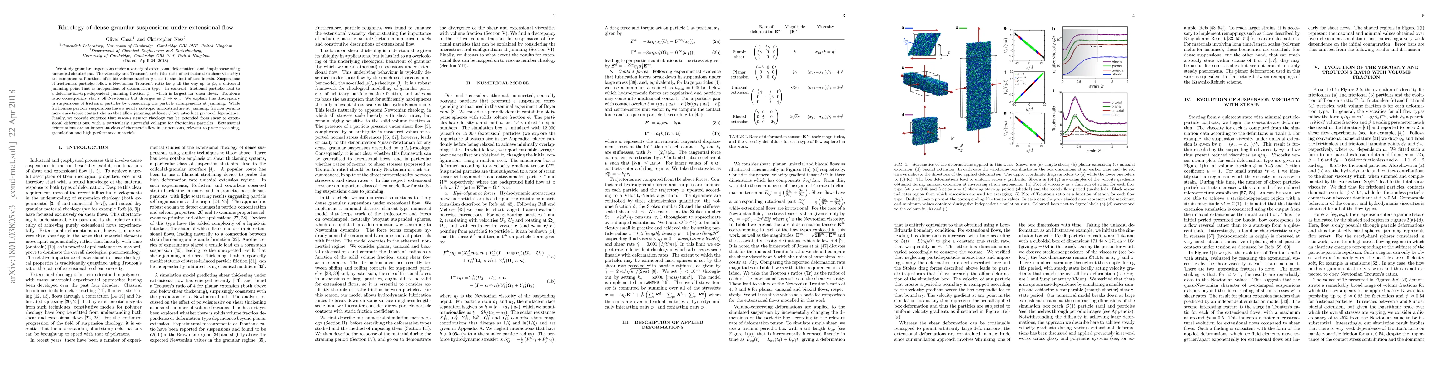 This study investigates the rheology of dense granular suspensions under extensional and shear flows using numerical simulations, revealing that frictionless particles maintain a Newtonian Trouton's ratio up to a universal jamming fraction, while frictional particles exhibit a deformation-type-dependent jamming fraction and a diverging Trouton's ratio due to anisotropic contact chains.