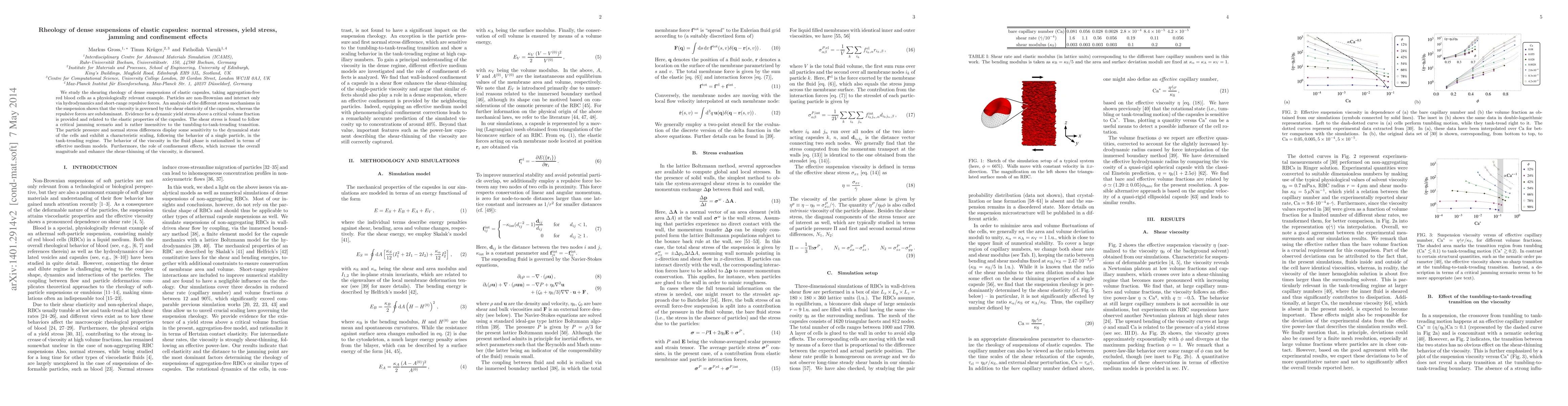 This paper investigates the rheological behavior of dense suspensions of elastic capsules, focusing on normal stresses, yield stress, and jamming effects. The study finds that the viscosity is primarily influenced by the shear elasticity of the capsules, while repulsive forces play a minor role.