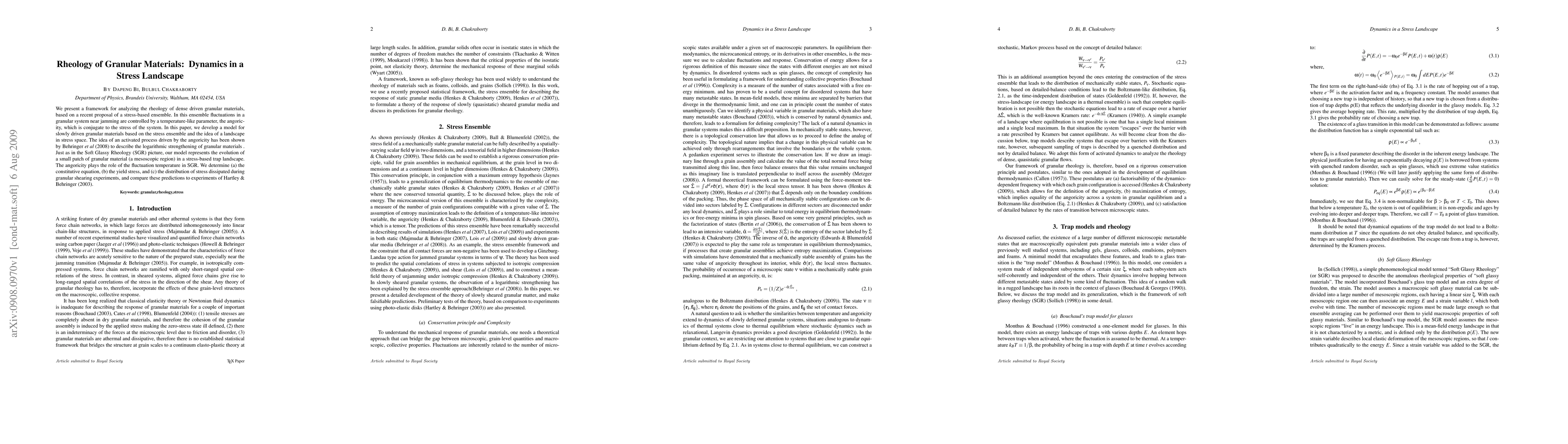 This paper develops a framework for analyzing the rheology of dense granular materials using a stress-based ensemble, introducing angoricity as a temperature-like parameter. The model predicts constitutive equations, yield stress, and stress distribution, and compares these predictions to experimental data.