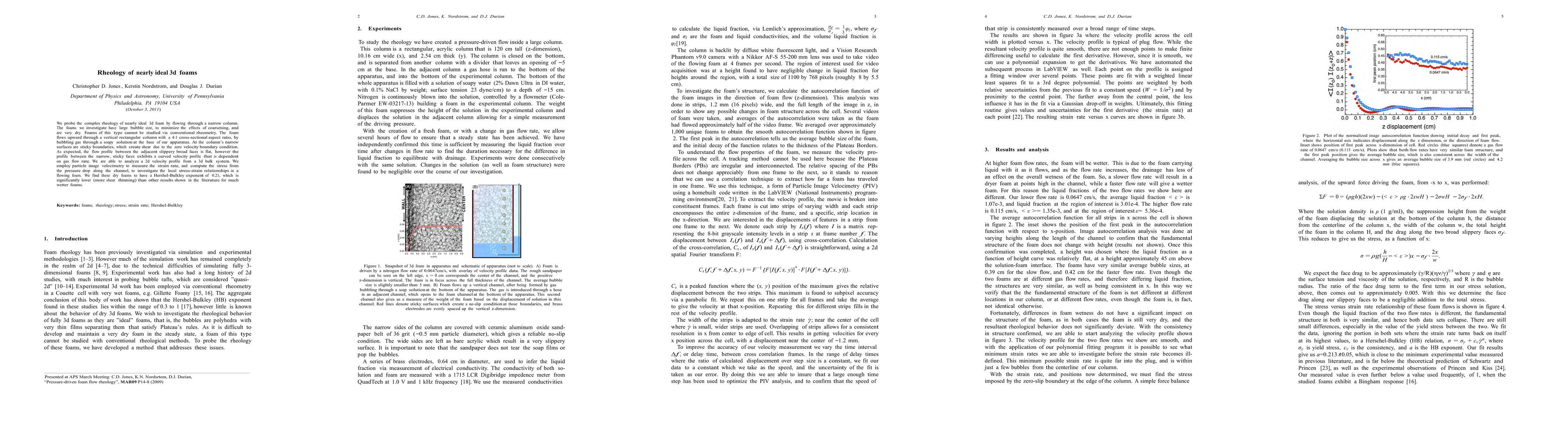 We probe the complex rheology of nearly ideal 3d foam by flowing through a narrow column. The foams we investigate have large bubble size, to minimize the effects of coarsening, and are very dry. Foams of this type cannot be studied via conventional rheometry. The foam flows upward through a vertical rectangular column with a 4:1 cross-sectional aspect ratio, by bubbling gas through a soapy solution at the base of our apparatus. At the column's narrow surfaces are sticky boundaries, which create shear due to the zero velocity boundary condition. As expected, the flow profile between the adjacent slippery broad faces is flat, however the profile between the narrow, sticky faces exhibits a curved velocity profile that is dependent on gas flow rate. We are able to analyze a 2d velocity profile from a 3d bulk system. We employ particle image velocimetry to measure the strain rate, and compute the stress from the pressure drop along the channel, to investigate the local stress-strain relationships in a flowing foam. We find these dry foams to have a Hershel-Bulkley exponent of 0.21, which is significantly lower (more shear thinning) than other results shown in the literature for much wetter foams.