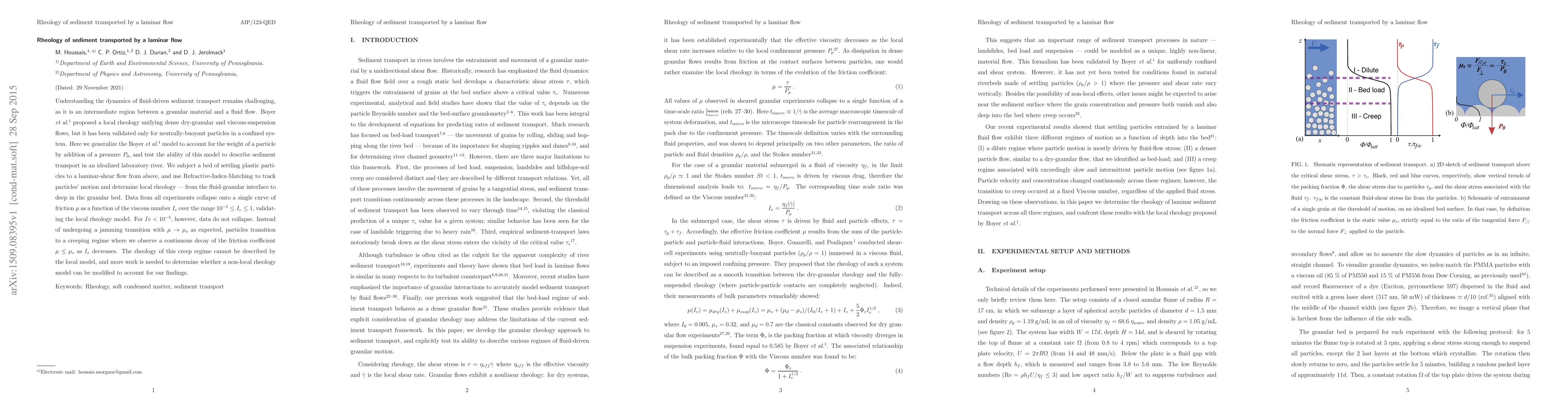 This study generalizes a local rheology model for fluid-driven sediment transport to include particle weight, and validates it through experiments on settling plastic particles in laminar flow. The model successfully describes sediment transport for a range of viscous numbers, but fails for very low viscous numbers, revealing a creeping regime instead of a jamming transition.