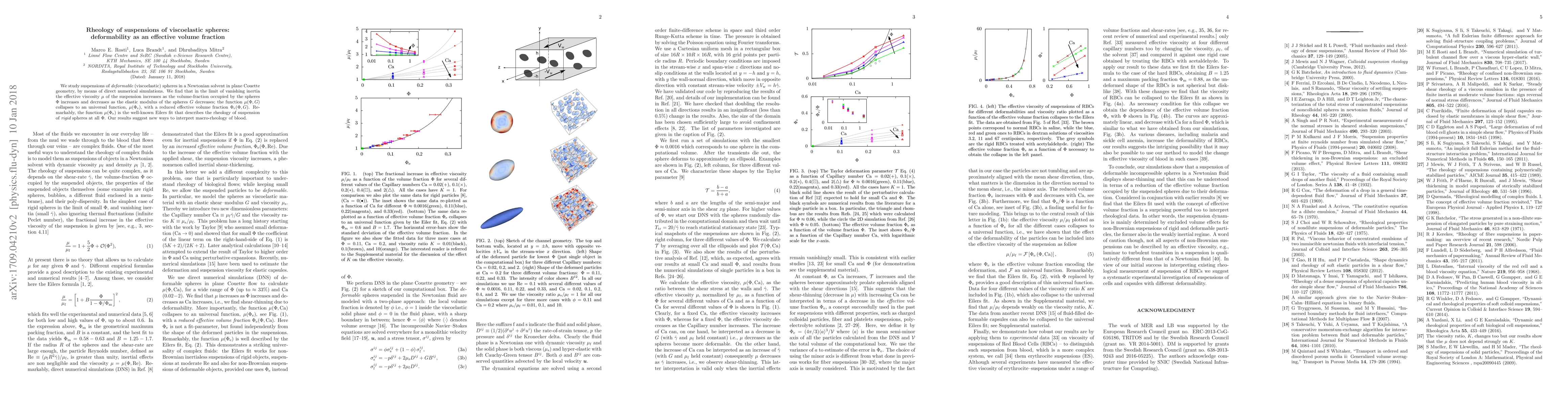We study suspensions of deformable (viscoelastic) spheres in a Newtonian solvent in plane Couette geometry, by means of direct numerical simulations. We find that in the limit of vanishing inertia the effective viscosity $\mu$ of the suspension increases as the volume-fraction occupied by the spheres $\Phi$ increases and decreases as the elastic modulus of the spheres $G$ decreases; the function $\mu(\Phi,G)$ collapses to an universal function, $\mu(\Phi_e)$, with a reduced effective volume fraction $\Phi_e(\Phi,G)$. Remarkably, the function $\mu(\Phi_e)$ is the well-known Eilers fit that describes the rheology of suspension of rigid spheres at all $\Phi$. Our results suggest new ways to interpret macro-rheology of blood.
