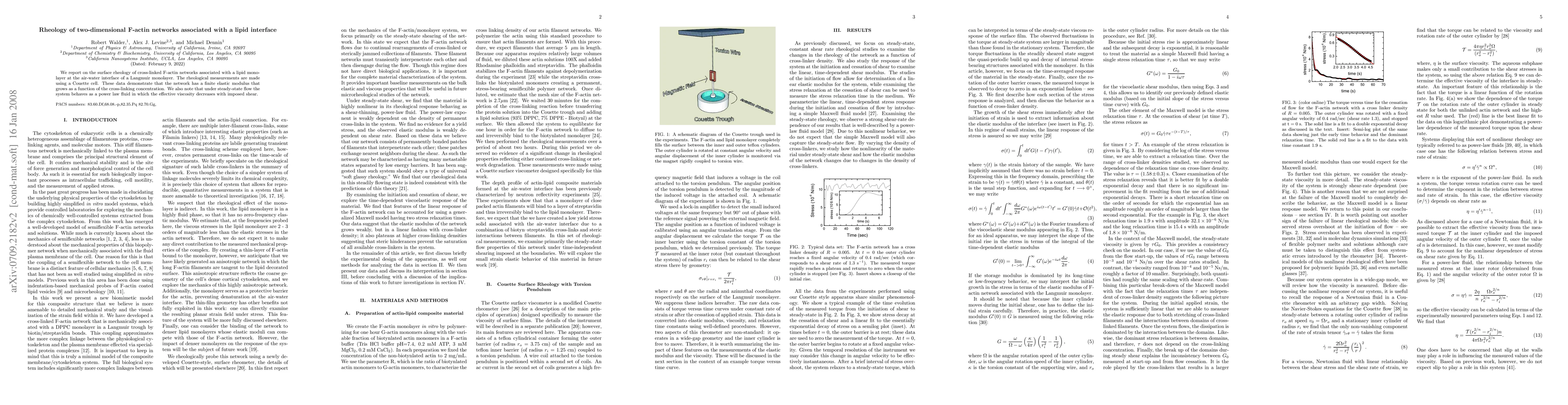 We report on the surface rheology of cross-linked F-actin networks associated with a lipid monolayer at the air-water interface of a Langmuir monolayer. The rheological measurements are made using a Couette cell. These data demonstrate that the network has a finite elastic modulus that grows as a function of the cross-linking concentration. We also note that under steady-state flow the system behaves as a power law fluid in which the effective viscosity decreases with imposed shear.