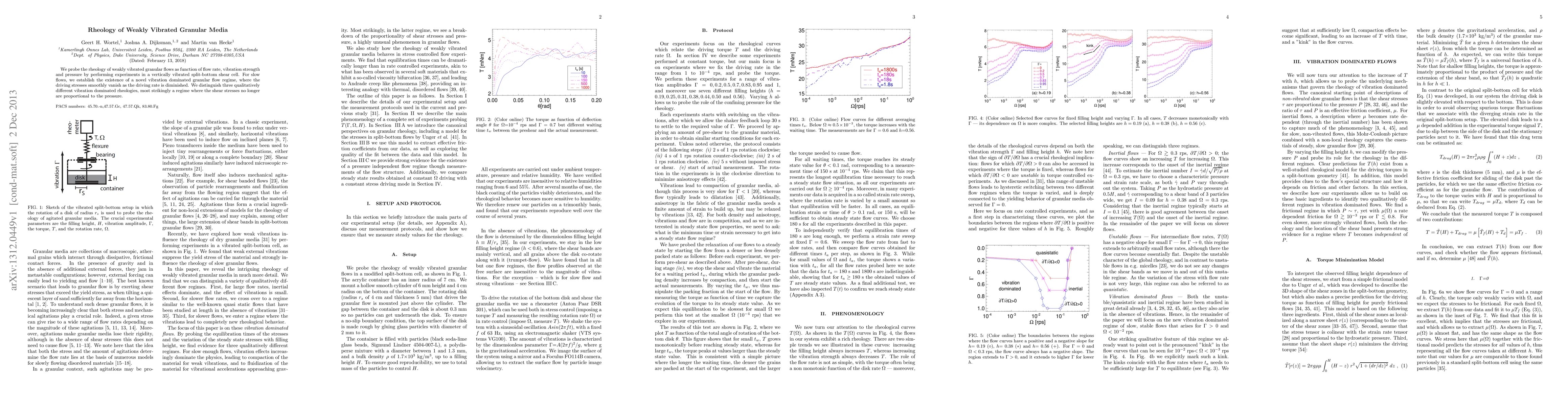 This study explores the rheology of granular flows under weak vibrations, identifying a novel vibration-dominated regime where driving stresses decrease with flow rate. It reveals three distinct rheological behaviors, notably a regime where shear stresses deviate from pressure proportionality.