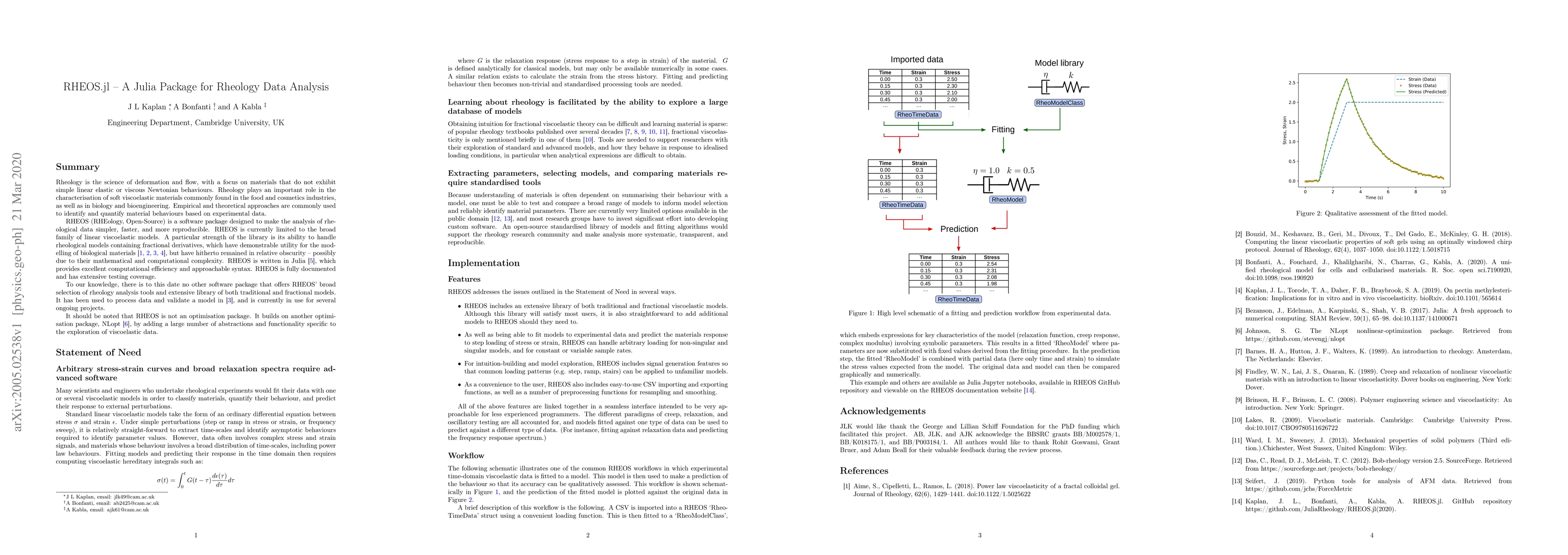 RHEOS.jl is a Julia-based open-source package designed to simplify and enhance the reproducibility of rheology data analysis, particularly for linear viscoelastic models and those involving fractional derivatives. It leverages Julia's computational efficiency and provides extensive documentation and testing.