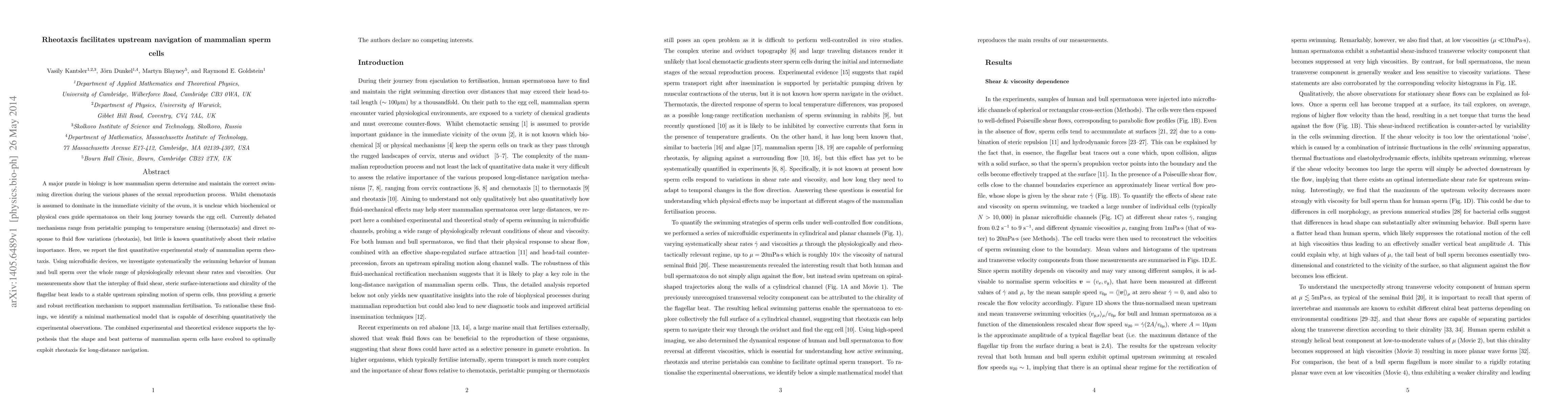 This study investigates how mammalian sperm navigate upstream using rheotaxis, demonstrating through microfluidic experiments and mathematical modeling that sperm exhibit stable spiraling motion driven by fluid shear, steric interactions, and flagellar chirality, thus supporting their journey towards the egg.