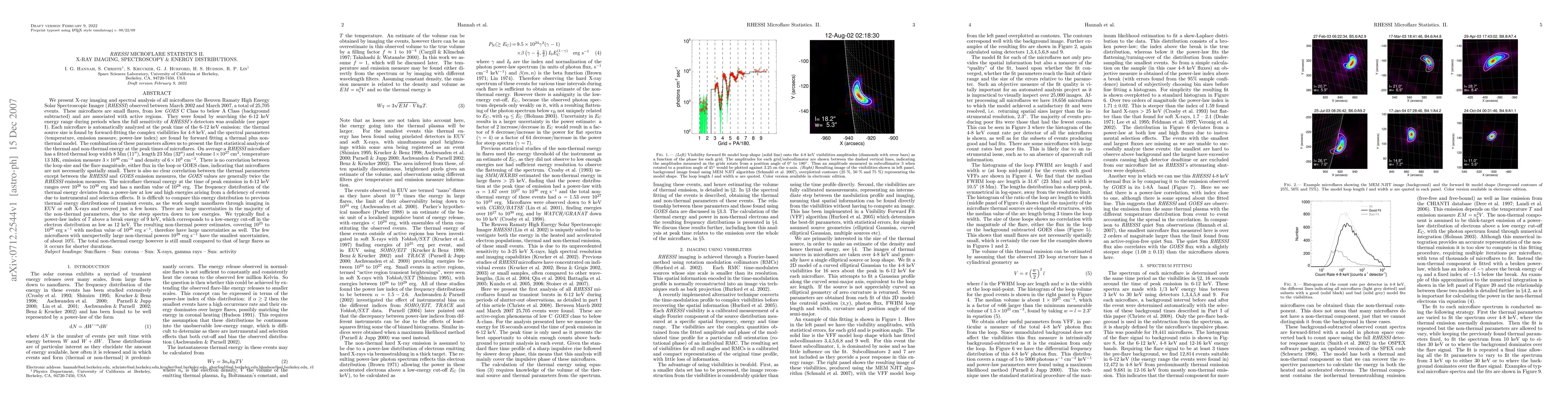 We present X-ray imaging and spectral analysis of all microflares the Reuven Ramaty High Energy Solar Spectroscopic Imager (RHESSI) observed between March 2002 and March 2007, a total of 25,705 events. These microflares are small flares, from low GOES C Class to below A Class (background subtracted) and are associated with active regions. They were found by searching the 6-12 keV energy range during periods when the full sensitivity of RHESSI's detectors was available (see paper I). Each microflare is automatically analyzed at the peak time of the 6-12 keV emission: the thermal source size is found by forward-fitting the complex visibilities for 4-8 keV, and the spectral parameters (temperature, emission measure, power-law index) are found by forward fitting a thermal plus non-thermal model. The combination of these parameters allows us to present the first statistical analysis of the thermal and non-thermal energy at the peak times of microflares.