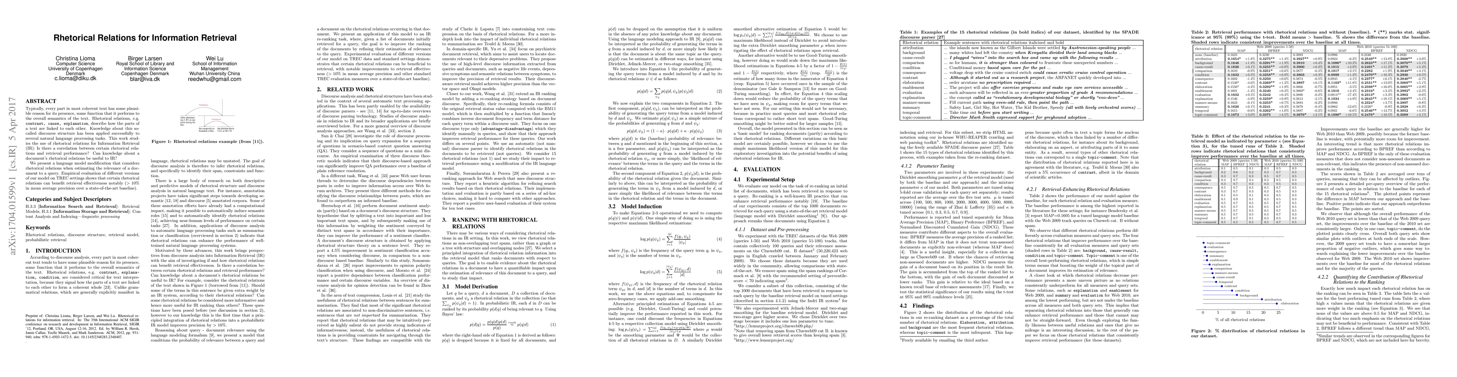 This paper investigates the impact of rhetorical relations on Information Retrieval (IR) performance, proposing a modified language model that incorporates rhetorical relations to estimate document relevance. Empirical results show a significant improvement (> 10% in mean average precision) over a baseline model, demonstrating the utility of rhetorical relations in IR.