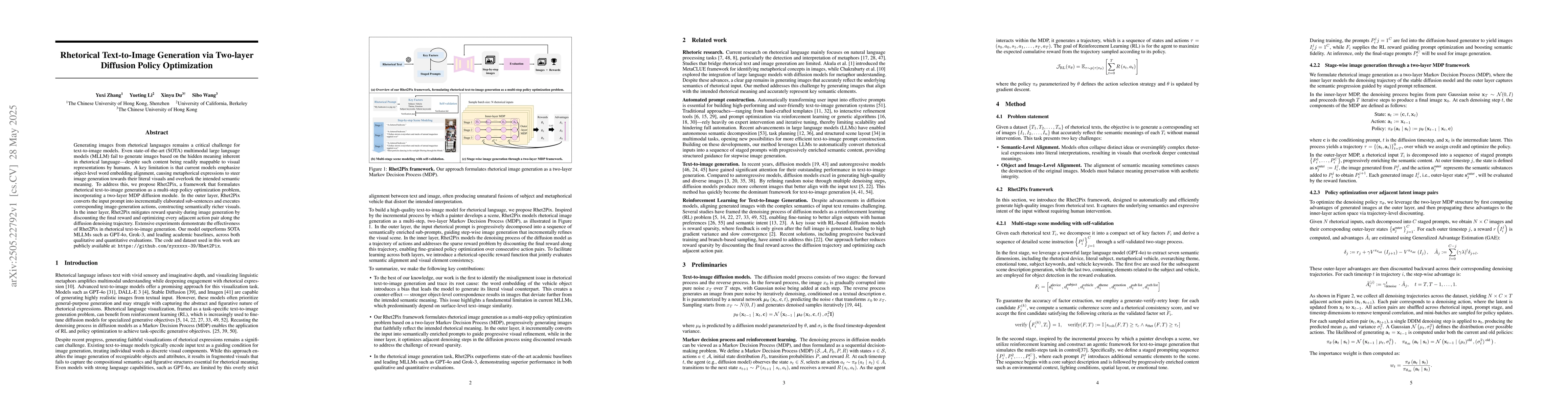 Generating images from rhetorical languages remains a critical challenge for text-to-image models. Even state-of-the-art (SOTA) multimodal large language models (MLLM) fail to generate images based on the hidden meaning inherent in rhetorical language--despite such content being readily mappable to visual representations by humans. A key limitation is that current models emphasize object-level word embedding alignment, causing metaphorical expressions to steer image generation towards their literal visuals and overlook the intended semantic meaning. To address this, we propose Rhet2Pix, a framework that formulates rhetorical text-to-image generation as a multi-step policy optimization problem, incorporating a two-layer MDP diffusion module. In the outer layer, Rhet2Pix converts the input prompt into incrementally elaborated sub-sentences and executes corresponding image-generation actions, constructing semantically richer visuals. In the inner layer, Rhet2Pix mitigates reward sparsity during image generation by discounting the final reward and optimizing every adjacent action pair along the diffusion denoising trajectory. Extensive experiments demonstrate the effectiveness of Rhet2Pix in rhetorical text-to-image generation. Our model outperforms SOTA MLLMs such as GPT-4o, Grok-3 and leading academic baselines across both qualitative and quantitative evaluations. The code and dataset used in this work are publicly available.
