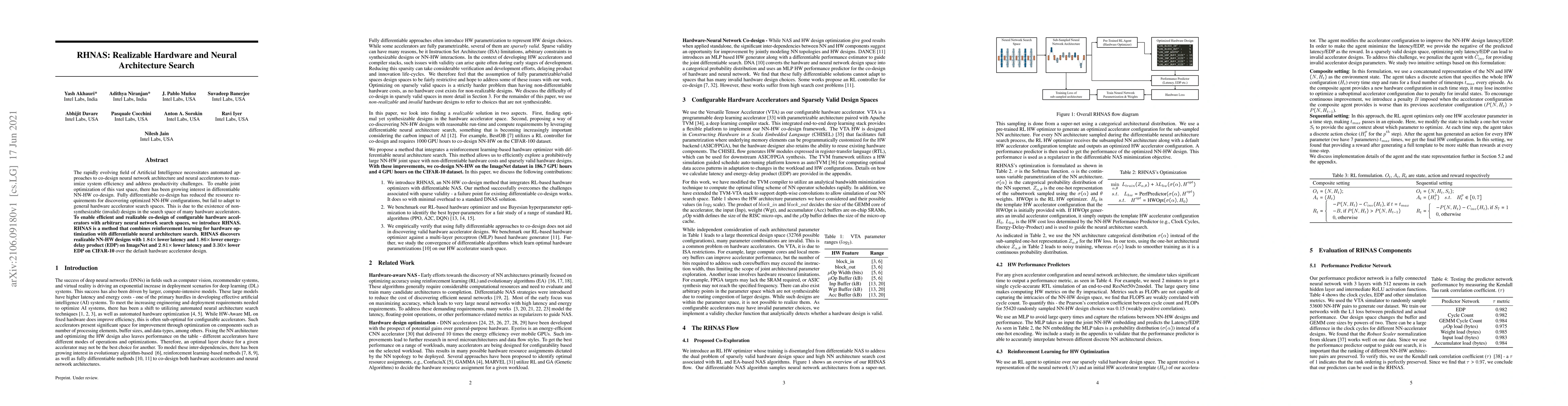 RHNAS integrates reinforcement learning with differentiable neural architecture search to optimize both neural network architectures and hardware accelerators, achieving significant reductions in latency and energy-delay product across multiple datasets. This method effectively handles non-synthesizable designs in hardware accelerator search spaces.