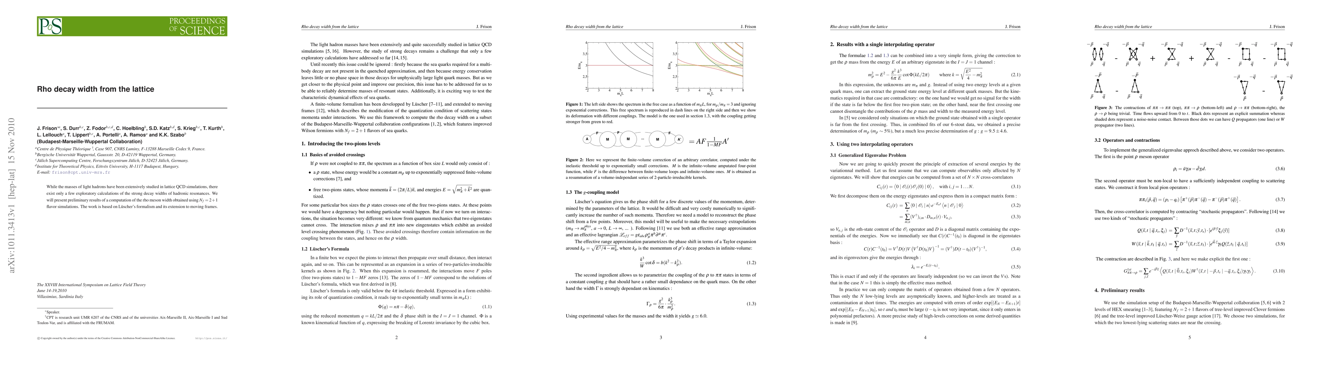 This paper presents preliminary results from lattice QCD simulations for the decay width of the rho meson, utilizing $N_f=2+1$ flavor simulations and extending Lüscher's formalism to moving frames. This study aims to fill the gap in existing research on the strong decay widths of hadronic resonances.
