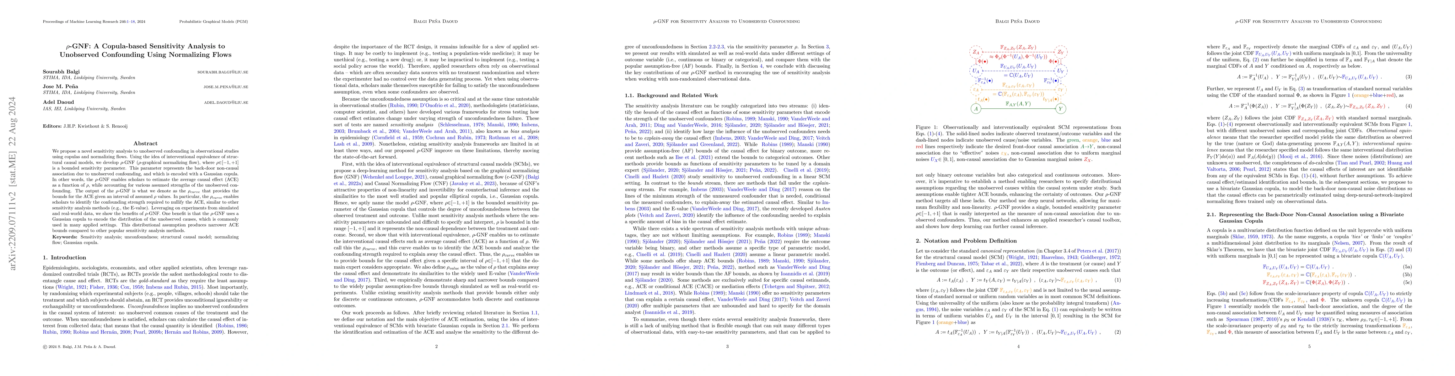 The paper introduces a novel $\rho$-GNF model for sensitivity analysis under unobserved confounders, combining copulas and normalizing flows to estimate causal effects. The $\rho_{curve}$ derived from this model provides bounds for the average causal effect, revealing the confounding strength needed to nullify the effect.