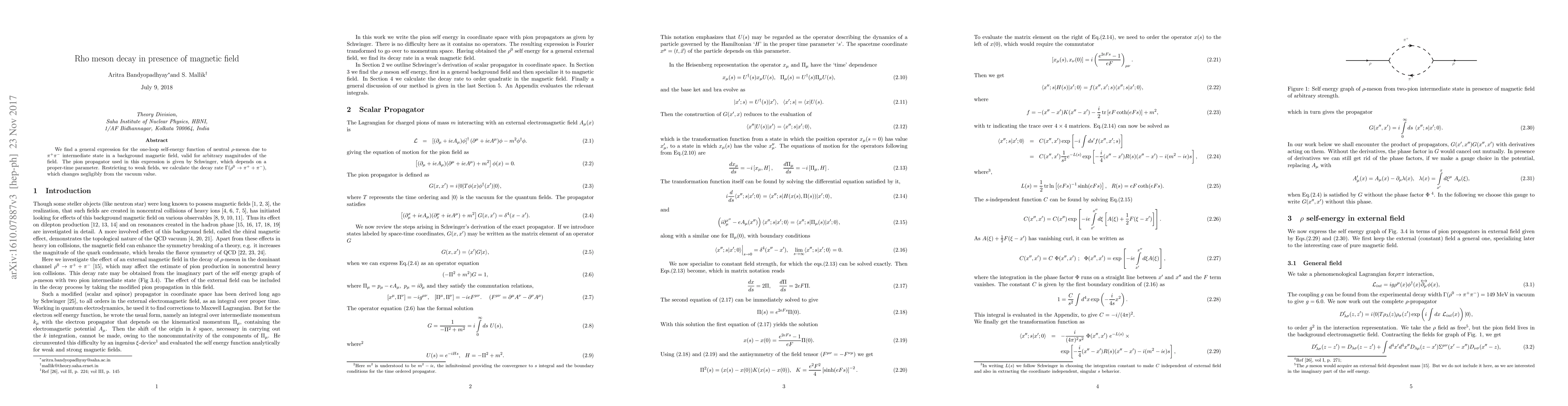 Summary: This paper derives a general expression for the one-loop self-energy of a neutral ρ-meson in a magnetic field, using the Schwinger propagator. It finds that the decay rate of ρ-meson into pions changes insignificantly under weak magnetic fields.
