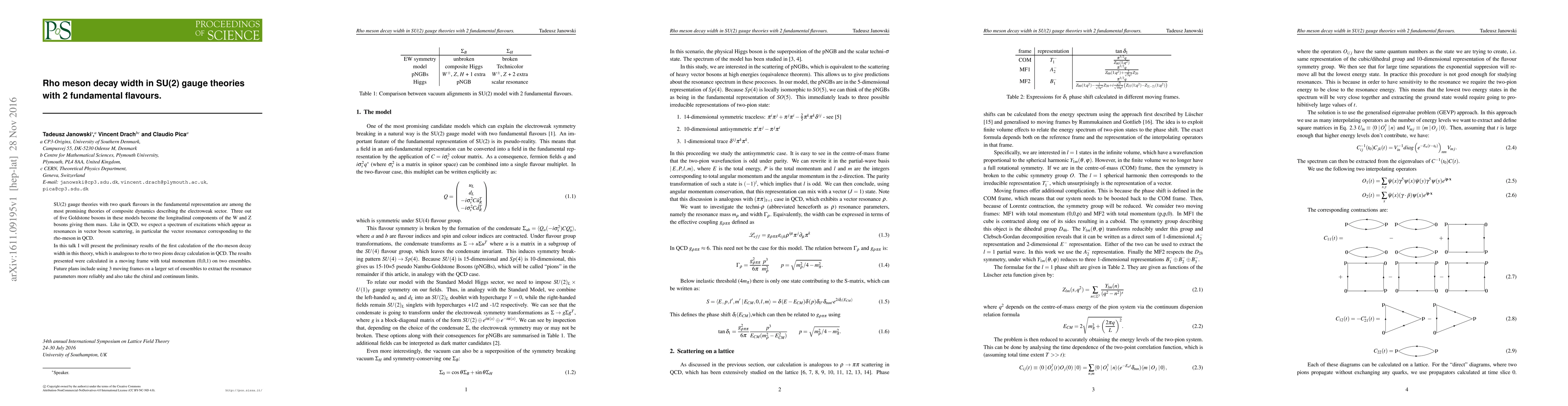 SU(2) gauge theories with two quark flavours in the fundamental representation are among the most promising theories of composite dynamics describing the electroweak sector. Three out of five Goldstone bosons in these models become the longitudinal components of the W and Z bosons giving them mass. Like in QCD, we expect a spectrum of excitations which appear as resonances in vector boson scattering, in particular the vector resonance corresponding to the rho-meson in QCD. In this talk I will present the preliminary results of the first calculation of the rho-meson decay width in this theory, which is analogous to rho to two pions decay calculation in QCD. The results presented were calculated in a moving frame with total momentum (0,0,1) on two ensembles. Future plans include using 3 moving frames on a larger set of ensembles to extract the resonance parameters more reliably and also take the chiral and continuum limits.