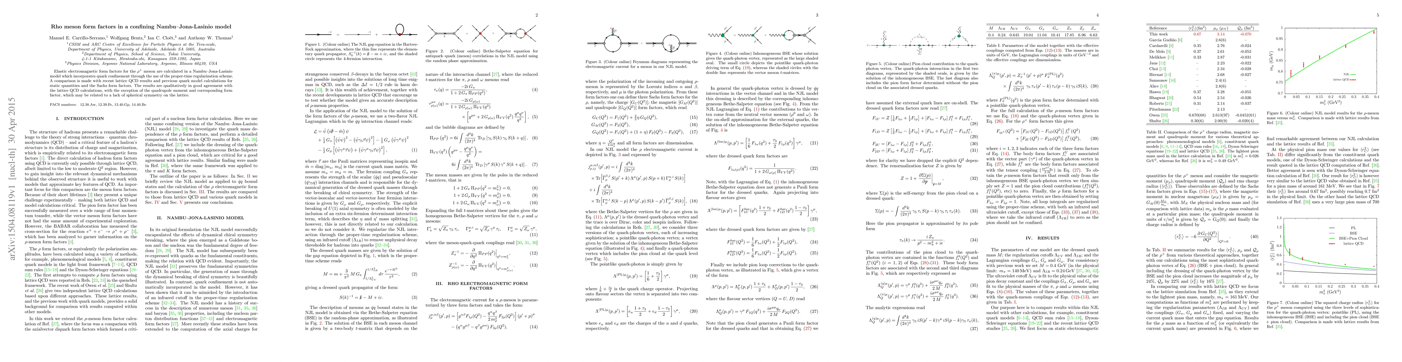 This study calculates the elastic electromagnetic form factors for the $\rho^+$ meson using a Nambu--Jona-Lasinio model with quark confinement, showing qualitative agreement with lattice QCD results, except for discrepancies in the quadrupole moment possibly due to lattice symmetry issues.