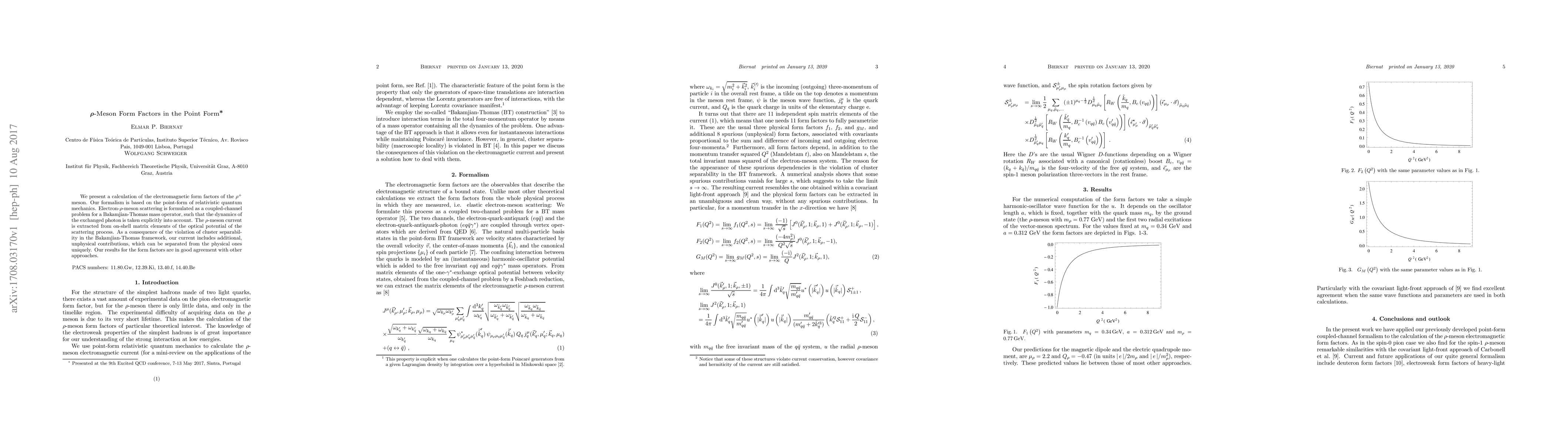 This paper calculates the electromagnetic form factors of the $\rho^+$ meson using the point-form of relativistic quantum mechanics, addressing electron-$\rho$-meson scattering as a coupled-channel problem. It extracts the $\rho$-meson current from on-shell matrix elements and separates physical from unphysical contributions, yielding results consistent with other methods.