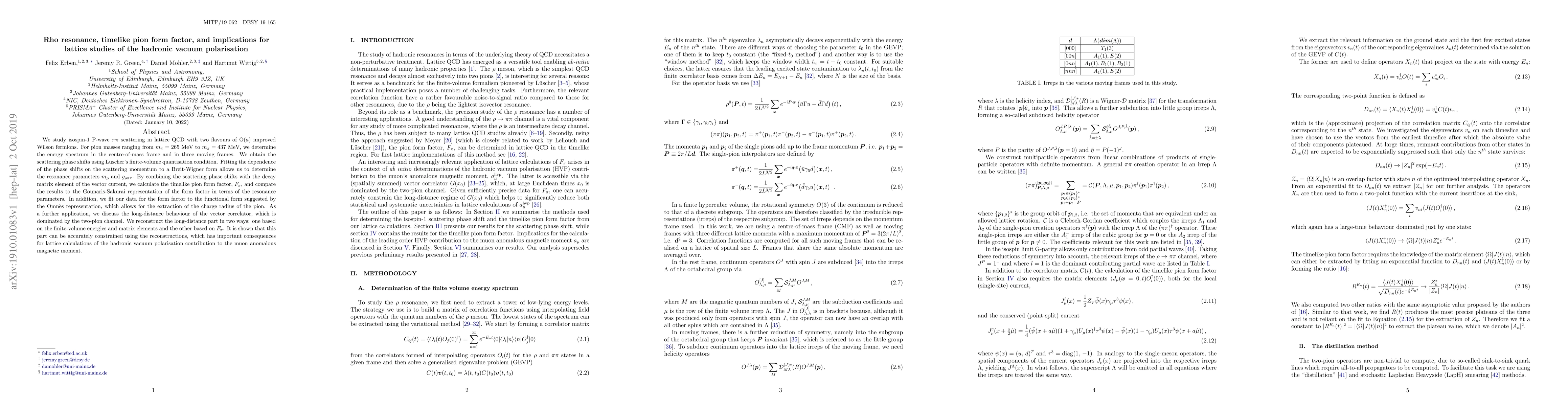 We study isospin-1 P-wave $\pi\pi$ scattering in lattice QCD with two flavours of O($a$) improved Wilson fermions. For pion masses ranging from $m_\pi=265$ MeV to $m_\pi=437$ MeV, we determine the energy spectrum in the centre-of-mass frame and in three moving frames. We obtain the scattering phase shifts using L\"uscher's finite-volume quantisation condition. Fitting the dependence of the phase shifts on the scattering momentum to a Breit-Wigner form allows us to determine the resonance parameters $m_\rho$ and $g_{\rho\pi\pi}$. By combining the scattering phase shifts with the decay matrix element of the vector current, we calculate the timelike pion form factor, $F_\pi$, and compare the results to the Gounaris-Sakurai representation of the form factor in terms of the resonance parameters. In addition, we fit our data for the form factor to the functional form suggested by the Omn\`es representation, which allows for the extraction of the charge radius of the pion. As a further application, we discuss the long-distance behaviour of the vector correlator, which is dominated by the two-pion channel. We reconstruct the long-distance part in two ways: one based on the finite-volume energies and matrix elements and the other based on $F_\pi$. It is shown that this part can be accurately constrained using the reconstructions, which has important consequences for lattice calculations of the hadronic vacuum polarisation contribution to the muon anomalous magnetic moment.