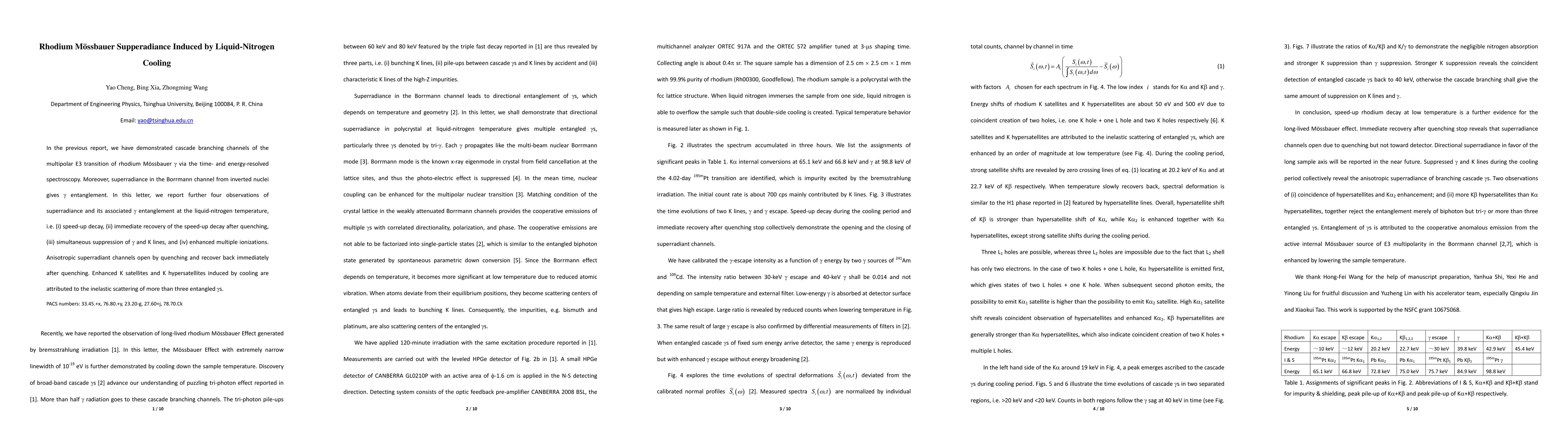 In the previous report, we have demonstrated cascade branching channels of the multipolar E3 transition of rhodium Mossbauer gamma via the time- and energy-resolved spectroscopy. Moreover, superradiance in the Borrmann channel from inverted nuclei gives gamma entanglement. In this letter, we report further four observations of superradiance and its associated gamma entanglement at the liquid-nitrogen temperature, i.e. (i) speed-up decay, (ii) immediate recovery of the speed-up decay after quenching, (iii) simultaneous suppression of gamma and K lines, and (iv) enhanced multiple ionizations. Anisotropic superradiant channels open by quenching and recover back immediately after quenching. Enhanced K satellites and K hypersatellites induced by cooling are attributed to the inelastic scattering of more than three entangled gammas.