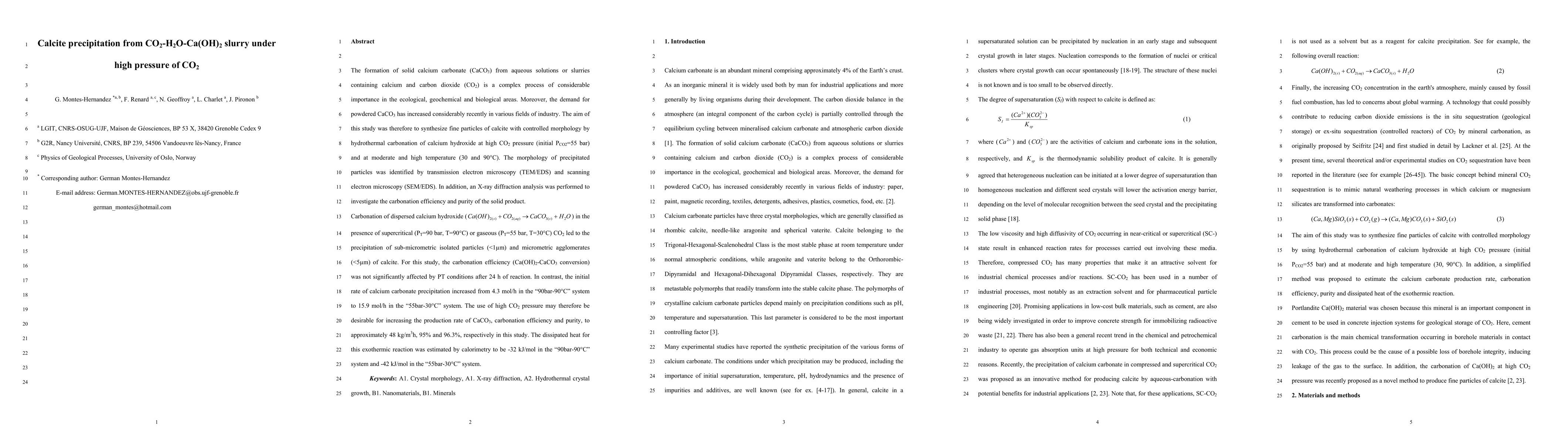 The formation of solid calcium carbonate (CaCO3) from aqueous solutions or slurries containing calcium and carbon dioxide (CO2) is a complex process of considerable importance in the ecological, geochemical and biological areas. Moreover, the demand for powdered CaCO3 has increased considerably recently in various fields of industry. The aim of this study was therefore to synthesize fine particles of calcite with controlled morphology by hydrothermal carbonation of calcium hydroxide at high CO2 pressure (initial PCO2=55 bar) and at moderate and high temperature (30 and 90 degrees C). The morphology of precipitated particles was identified by transmission electron microscopy (TEM/EDS) and scanning electron microscopy (SEM/EDS). In addition, an X-ray diffraction analysis was performed to investigate the carbonation efficiency and purity of the solid product. Carbonation of dispersed calcium hydroxide in the presence of supercritical (PT=90 bar, T=90 degrees C) or gaseous (PT=55 bar, T=30 degrees C) CO2 led to the precipitation of sub-micrometric isolated particles (<1$\mu$m) and micrometric agglomerates (<5$\mu$m) of calcite. For this study, the carbonation efficiency (Ca(OH)2-CaCO3 conversion) was not significantly affected by PT conditions after 24 h of reaction. In contrast, the initial rate of calcium carbonate precipitation increased from 4.3 mol/h in the "90bar-90 degrees C" system to 15.9 mol/h in the "55bar-30 degrees C" system. The use of high CO2 pressure may therefore be desirable for increasing the production rate of CaCO3, carbonation efficiency and purity, to approximately 48 kg/m3h, 95% and 96.3%, respectively in this study. The dissipated heat for this exothermic reaction was estimated by calorimetry to be -32 kJ/mol in the "90bar-90 degrees C" system and -42 kJ/mol in the "55bar-30 degrees C" system.