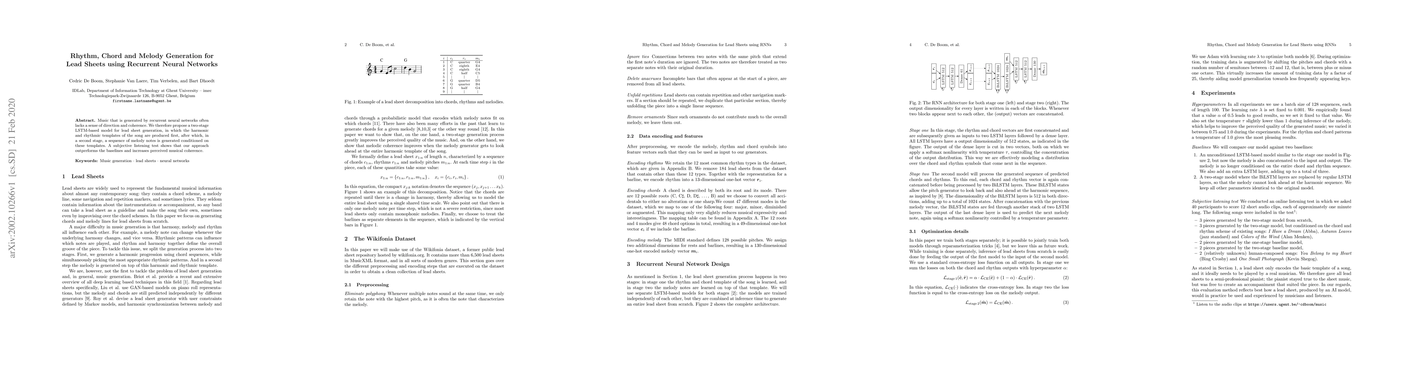 This paper proposes a two-stage LSTM-based model for generating lead sheets where harmonic and rhythmic templates are first created, followed by melody note generation conditioned on these templates, resulting in more coherent music compared to baselines. Subjective listening tests confirm the improved musical coherence of the generated music.