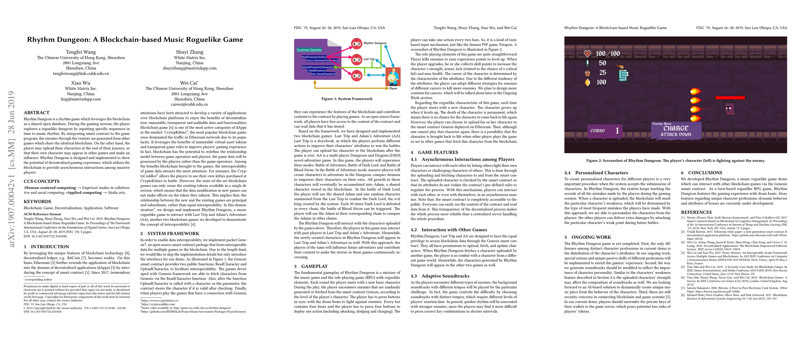 Rhythm Dungeon is a blockchain-based music roguelike game that uses smart contracts to generate enemies from shared blockchain games, allowing players to upload their characters to appear in other games, showcasing decentralized gaming potential.