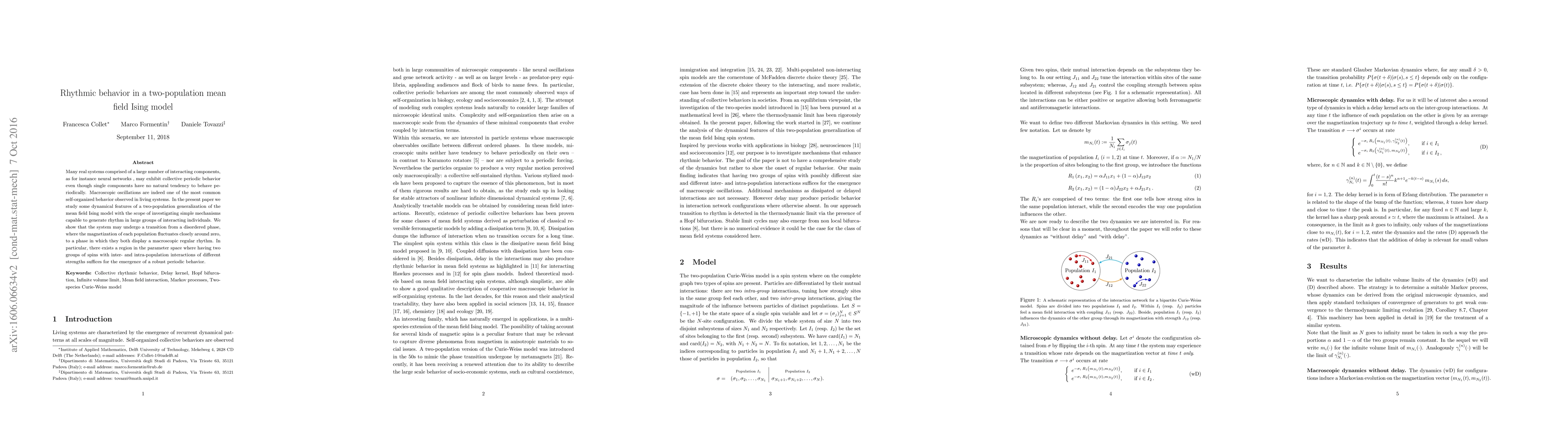 Many real systems comprised of a large number of interacting components, as for instance neural networks , may exhibit collective periodic behavior even though single components have no natural tendency to behave periodically. Macroscopic oscillations are indeed one of the most common self-organized behavior observed in living systems. In the present paper we study some dynamical features of a two-population generalization of the mean field Ising model with the scope of investigating simple mechanisms capable to generate rhythm in large groups of interacting individuals. We show that the system may undergo a transition from a disordered phase, where the magnetization of each population fluctuates closely around zero, to a phase in which they both display a macroscopic regular rhythm. In particular, there exists a region in the parameter space where having two groups of spins with inter- and intra-population interactions of different strengths suffices for the emergence of a robust periodic behavior.