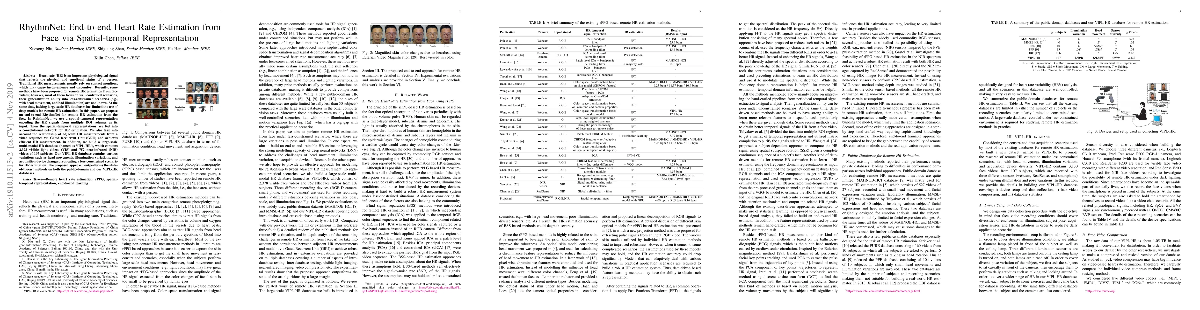 RhythmNet is an end-to-end model for remote heart rate estimation from face videos using spatial-temporal representations and a convolutional network with Gated Recurrent Units. The authors also introduce VIPL-HR, a large-scale multi-modal HR database with diverse variations, to improve model generalization.