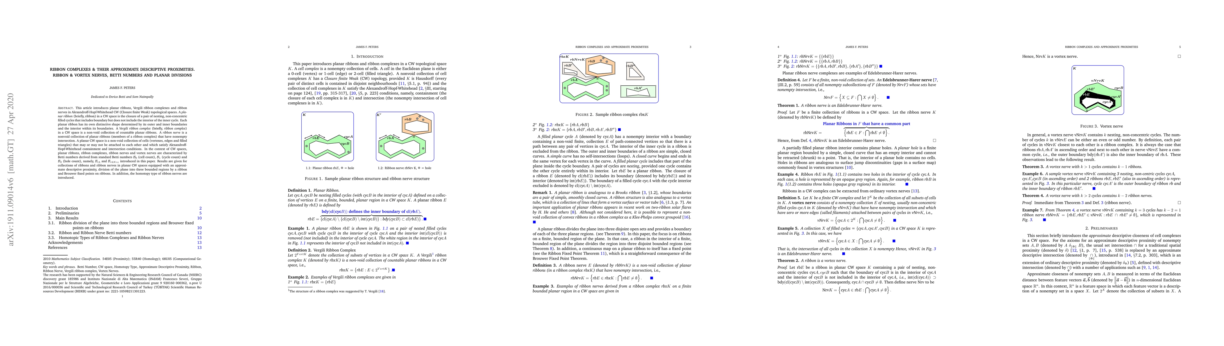 This paper explores planar ribbons and Vergili ribbon complexes within Alexandroff-Hopf-Whitehead CW spaces, defining ribbon nerves and characterizing them using Betti numbers. It introduces new Betti numbers and discusses the homotopy types, approximate descriptive proximities, and Brouwer fixed points associated with these structures.