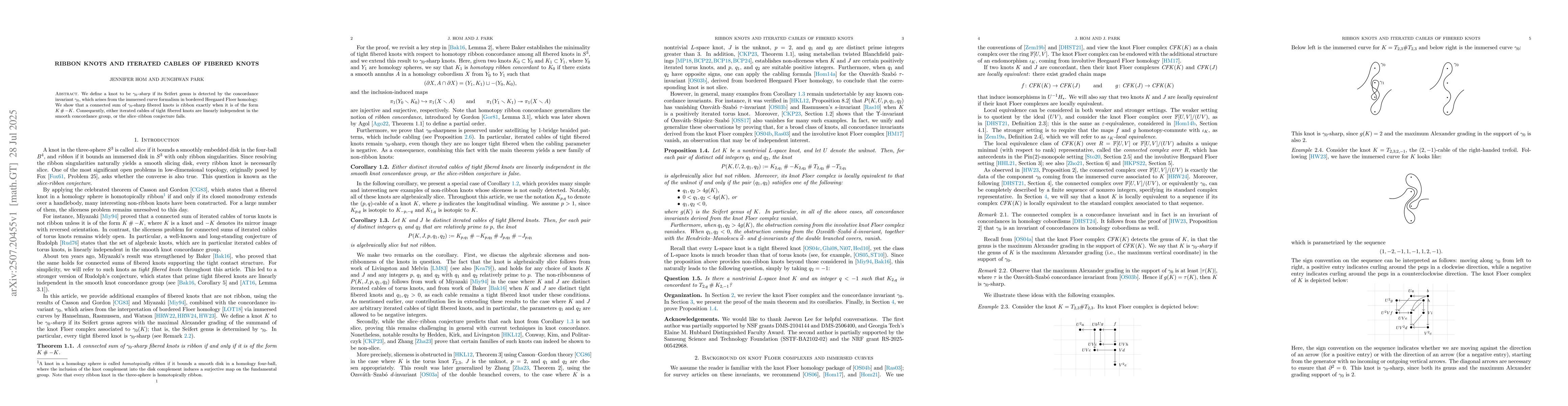 We define a knot to be $\gamma_0$-sharp if its Seifert genus is detected by the concordance invariant $\gamma_0$, which arises from the immersed curve formalism in bordered Heegaard Floer homology. We show that a connected sum of $\gamma_0$-sharp fibered knots is ribbon exactly when it is of the form $K \mathbin{\#} -K$. Consequently, either iterated cables of tight fibered knots are linearly independent in the smooth concordance group, or the slice--ribbon conjecture fails.