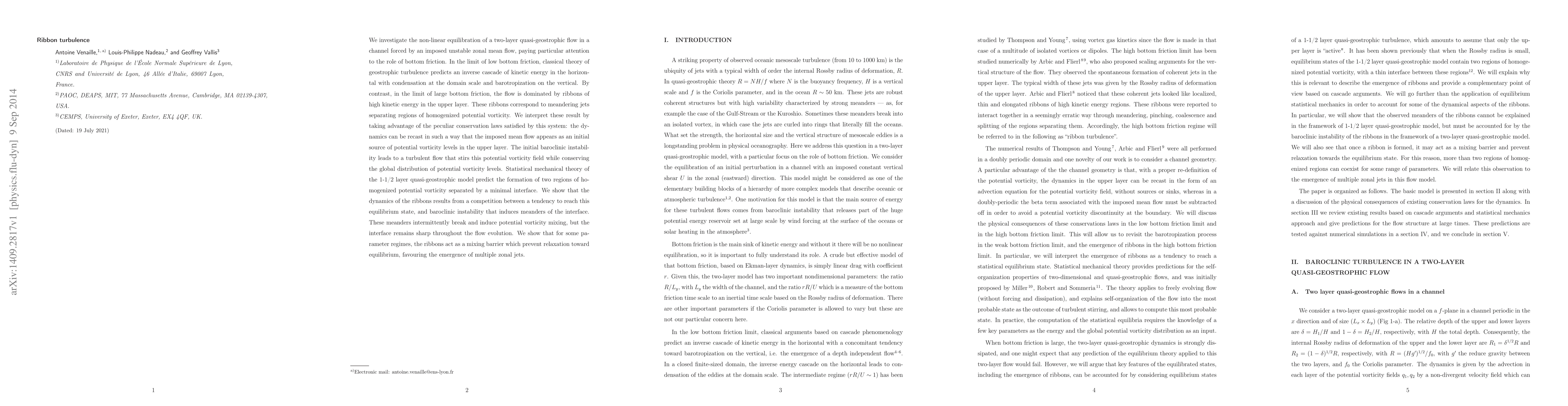 We investigate the non-linear equilibration of a two-layer quasi-geostrophic flow in a channel forced by an imposed unstable zonal mean flow, paying particular attention to the role of bottom friction. In the limit of low bottom friction, classical theory of geostrophic turbulence predicts an inverse cascade of kinetic energy in the horizontal with condensation at the domain scale and barotropization on the vertical. By contrast, in the limit of large bottom friction, the flow is dominated by ribbons of high kinetic energy in the upper layer. These ribbons correspond to meandering jets separating regions of homogenized potential vorticity. We interpret these result by taking advantage of the peculiar conservation laws satisfied by this system: the dynamics can be recast in such a way that the imposed mean flow appears as an initial source of potential vorticity levels in the upper layer. The initial baroclinic instability leads to a turbulent flow that stirs this potential vorticity field while conserving the global distribution of potential vorticity levels. Statistical mechanical theory of the 1-1/2 layer quasi-geostrophic model predict the formation of two regions of homogenized potential vorticity separated by a minimal interface. We show that the dynamics of the ribbons results from a competition between a tendency to reach this equilibrium state, and baroclinic instability that induces meanders of the interface. These meanders intermittently break and induce potential vorticity mixing, but the interface remains sharp throughout the flow evolution. We show that for some parameter regimes, the ribbons act as a mixing barrier which prevent relaxation toward equilibrium, favouring the emergence of multiple zonal jets.