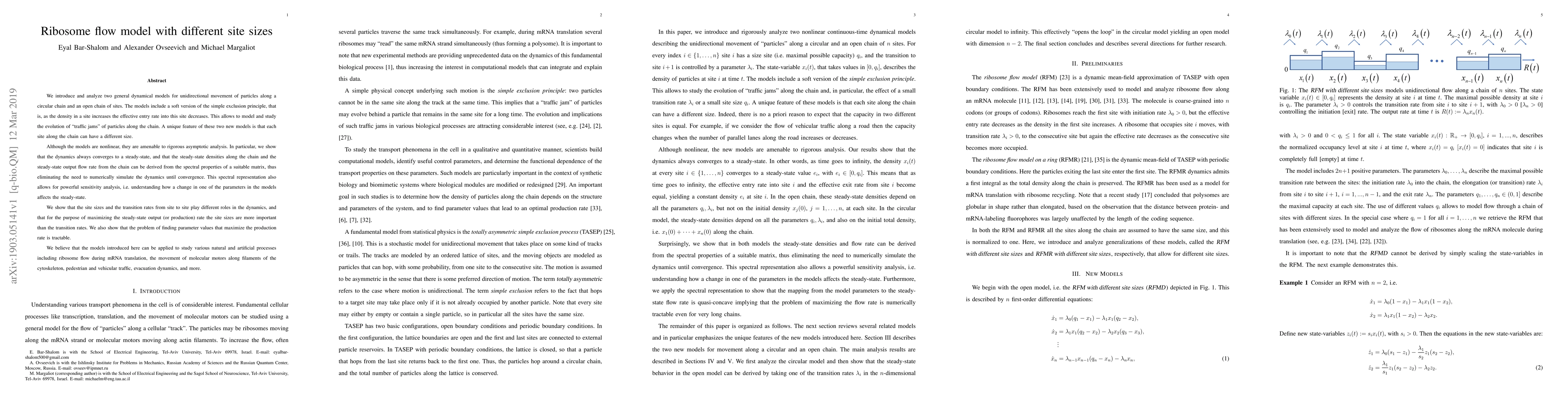 This paper presents two dynamical models for particle movement along circular and open chains with varying site sizes, incorporating a soft exclusion principle. The models' asymptotic analysis reveals that steady-state densities and output flow rates can be determined from spectral properties of a matrix, enabling sensitivity analysis. Site sizes are found to be more critical for maximizing production rates than transition rates, with this optimization problem being tractable. These models are applicable to diverse fields such as molecular biology, traffic dynamics, and evacuation studies.