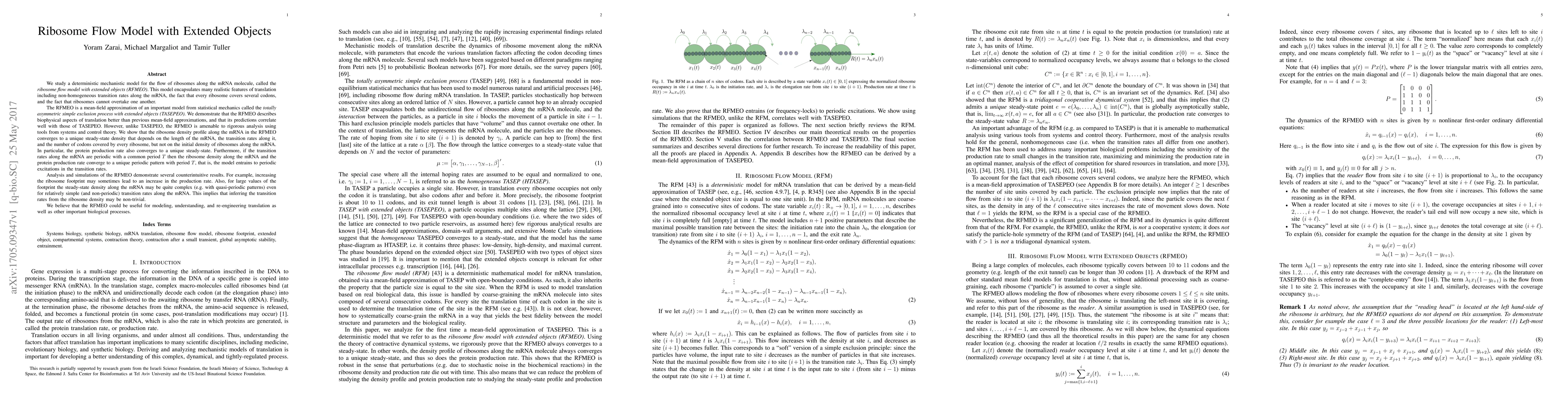 We study a deterministic mechanistic model for the flow of ribosomes along the mRNA molecule, called the ribosome flow model with extended objects (RFMEO). This model encapsulates many realistic features of translation including non-homogeneous transition rates along the mRNA, the fact that every ribosome covers several codons, and the fact that ribosomes cannot overtake one another. The RFMEO is a mean-field approximation of an important model from statistical mechanics called the totally asymmetric simple exclusion process with extended objects (TASEPEO). We demonstrate that the RFMEO describes biophysical aspects of translation better than previous mean-field approximations, and that its predictions correlate well with those of TASEPEO. However, unlike TASEPEO, the RFMEO is amenable to rigorous analysis using tools from systems and control theory. We show that the ribosome density profile along the mRNA in the RFMEO converges to a unique steady-state density that depends on the length of the mRNA, the transition rates along it, and the number of codons covered by every ribosome, but not on the initial density of ribosomes along the mRNA. In particular, the protein production rate also converges to a unique steady-state. Furthermore, if the transition rates along the mRNA are periodic with a common period T then the ribosome density along the mRNA and the protein production rate converge to a unique periodic pattern with period T, that is, the model entrains to periodic excitations in the transition rates. We believe that the RFMEO could be useful for modeling, understanding, and re-engineering translation as well as other important biological processes.