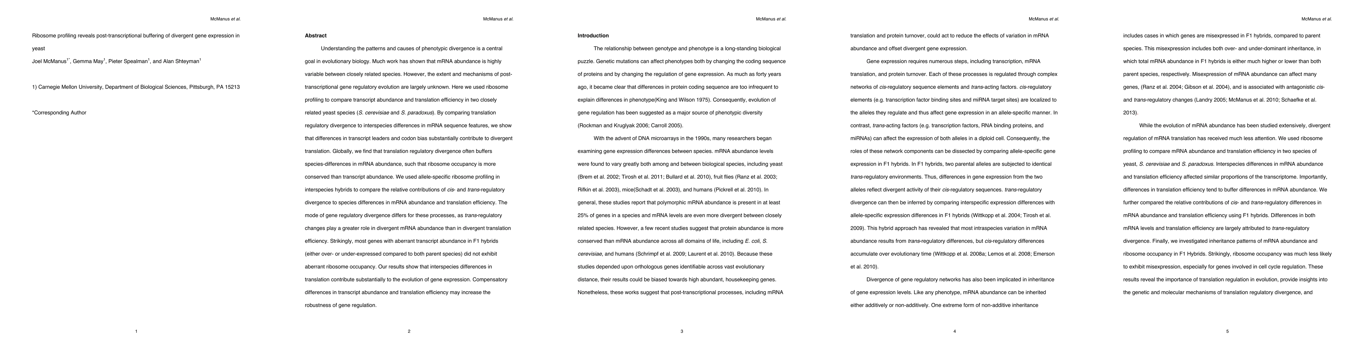 Ribosome profiling in two closely related yeast species reveals that post-transcriptional regulatory divergence buffers species-specific differences in mRNA abundance, maintaining ribosome occupancy despite transcript abundance variability. Trans-regulatory changes predominantly affect mRNA abundance, while translation efficiency is more buffered by compensatory regulatory mechanisms.