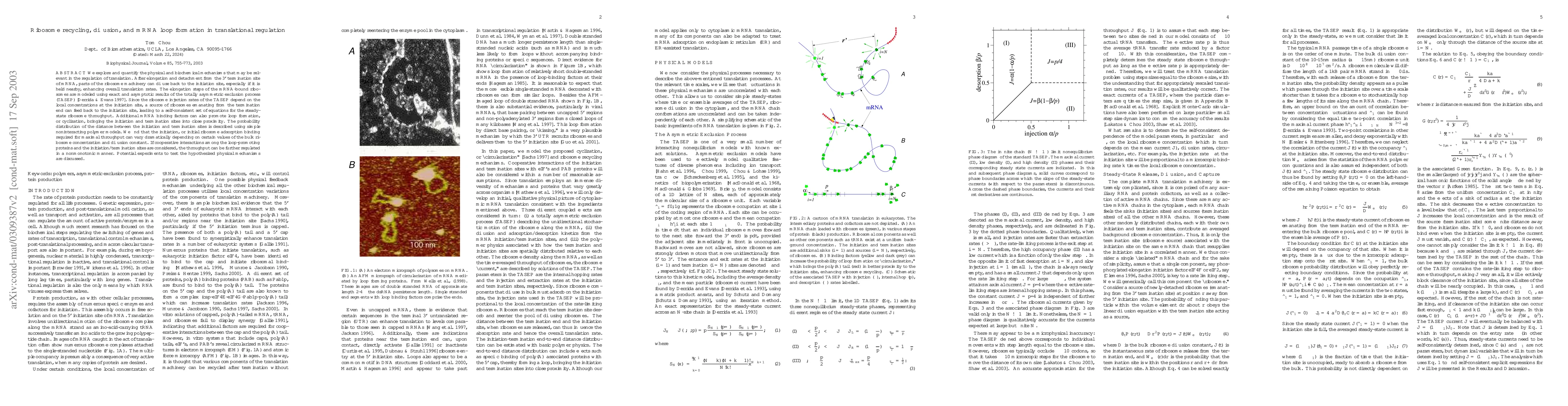 We explore and quantify the physical and biochemical mechanisms that may be relevant in the regulation of translation. After elongation and detachment from the 3' termination site of mRNA, parts of the ribosome machinery can diffuse back to the initiation site, especially if it is held nearby, enhancing overall translation rates. The elongation steps of the mRNA-bound ribosomes are modeled using exact and asymptotic results of the totally asymmetric exclusion process (TASEP).Since the ribosome injection rates of the TASEP depend on the local concentrations at the initiation site, a source of ribosomes emanating from the termination end can feed back to the initiation site, leading to a self-consistent set of equations for the steady-state ribosome throughput. Additional mRNA binding factors can also promote loop formation, or cyclization, bringing the initiation and termination sites into close proximity. The probability distribution of the distance between the initiation and termination sites is described using simple noninteracting polymer models. We find that the initiation, or initial ribosome adsorption binding required for maximal throughput can vary dramatically depending on certain values of the bulk ribosome concentration and diffusion constant. If cooperative interactions among the loop-promoting proteins and the initiation/termination sites are considered, the throughput can be further regulated in a nonmonotonic manner. Potential experiments to test the hypothesized physical mechanisms are discussed.