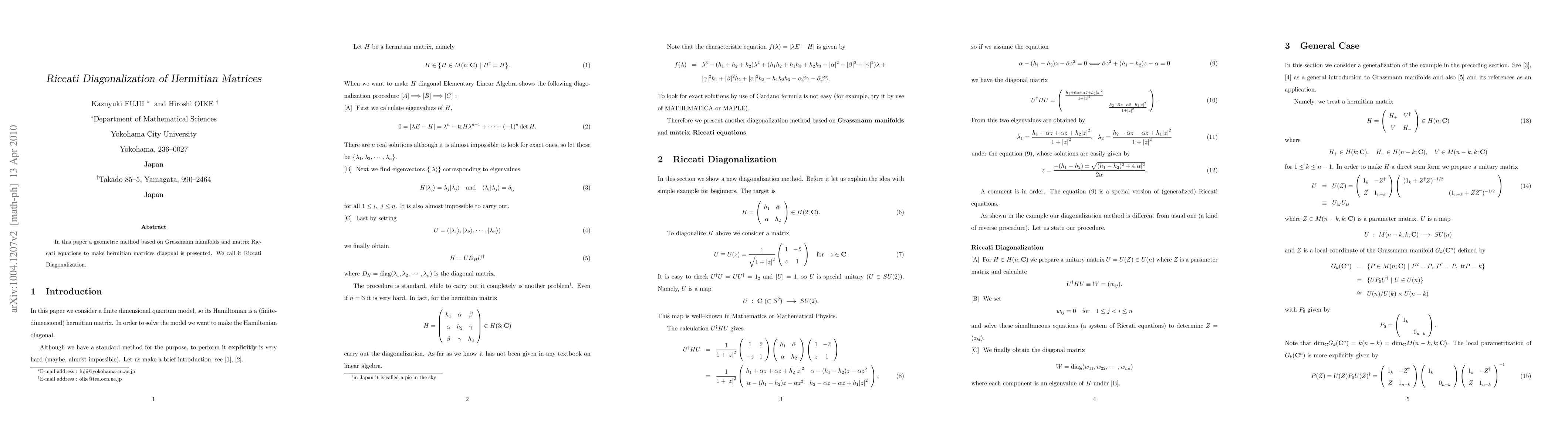 Summary: This paper introduces a novel geometric method utilizing Grassmann manifolds and matrix Riccati equations to diagonalize Hermitian matrices, termed Riccati Diagonalization. The method provides a new approach to achieving matrix diagonalization.