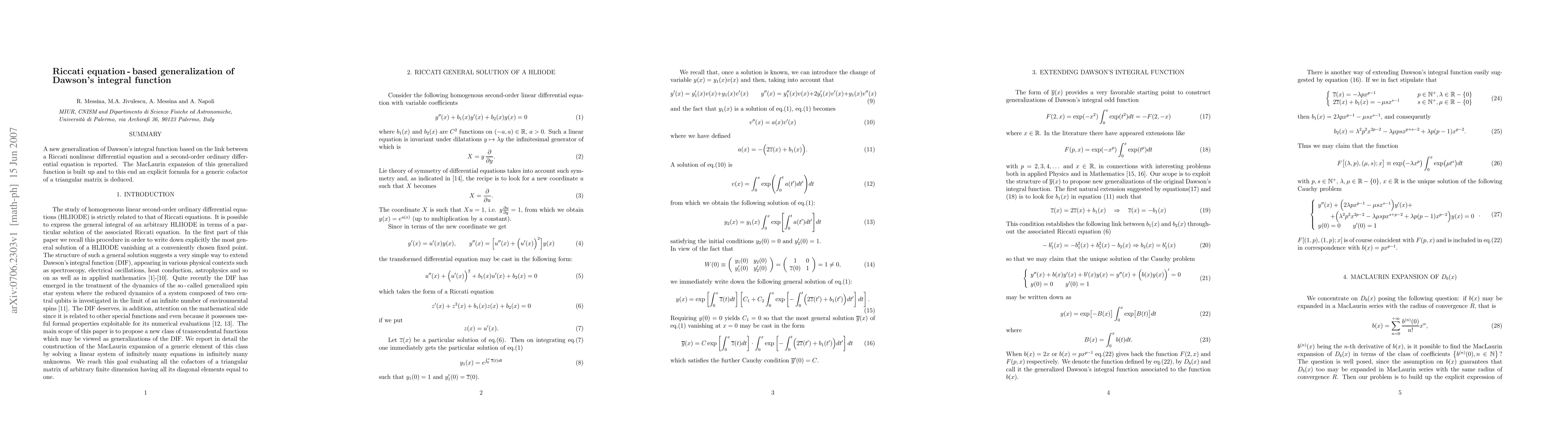 A new generalization of Dawson's integral function based on the link between a Riccati nonlinear differential equation and a second-order ordinary differential equation is reported. The MacLaurin expansion of this generalized function is built up and to this end an explicit formula for a generic cofactor of a triangular matrix is deduced.