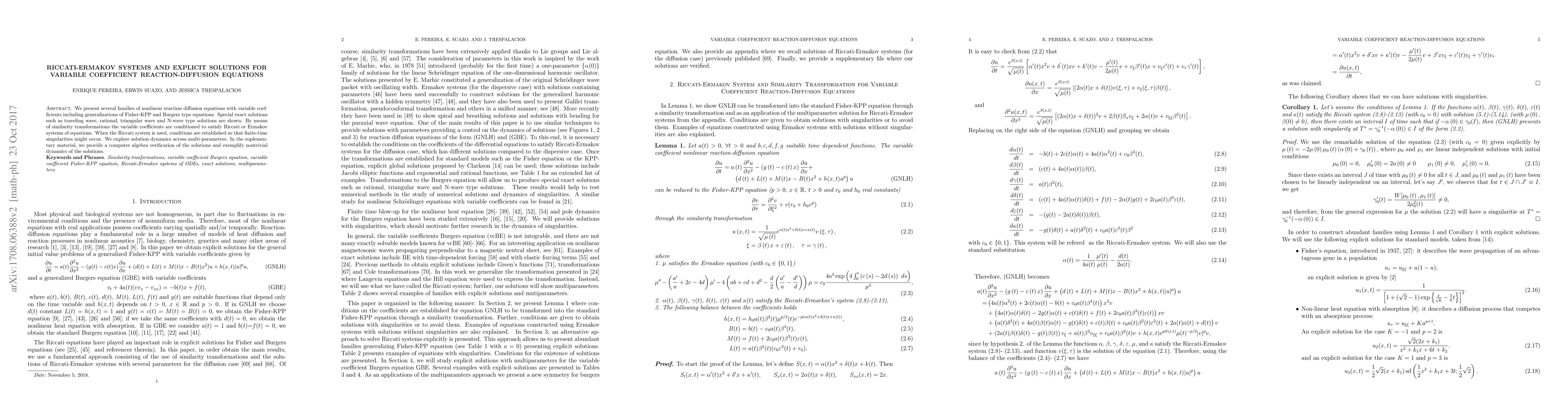 We present several families of nonlinear reaction diffusion equations with variable coefficients including Fisher-KPP and Burgers type equations. Special exact solutions such as traveling wave, rational, triangular wave and N-wave type solutions are shown. By means of similarity transformations the variable coefficients are conditioned to satisfy Riccati or Ermakov systems of equations. When the Riccati system is used, conditions are established so that finite-time singularities might occur. The solutions presented contain multi-parameters providing a control on the dynamics of the solutions. In the suplementary material, we provide a computer algebra verification of the solutions and exemplify nontrivial dynamics of the solutions.