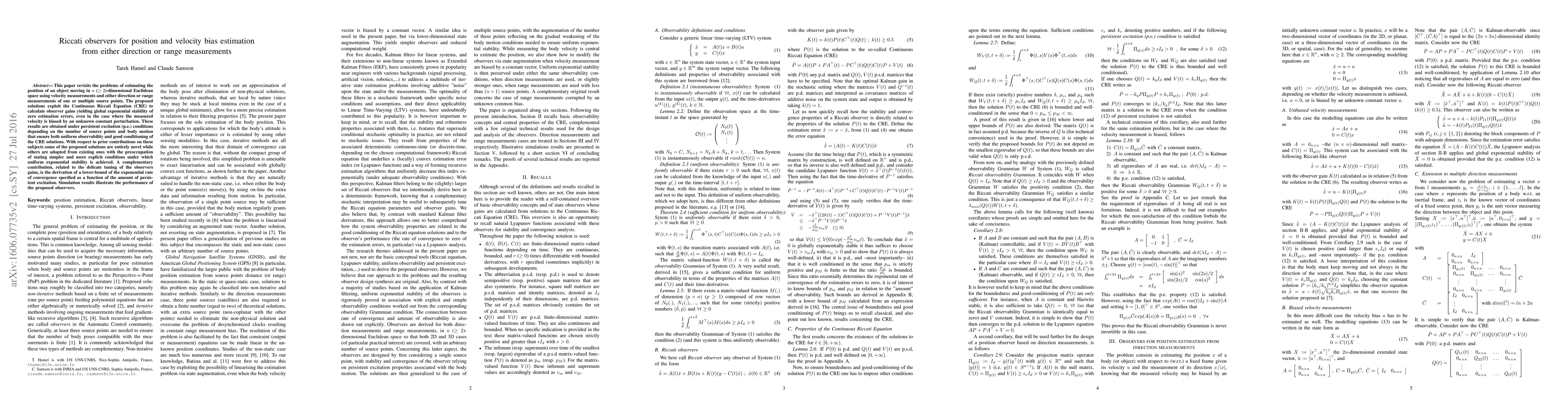 This paper revisits the problems of estimating the position of an object moving in $n$ ($\geq 2$)-dimensional Euclidean space using velocity measurements and either direction or range measurements of one or multiple source points. The proposed solutions exploit the Continuous Riccati Equation (CRE) to calculate observer gains yielding global exponential stability of zero estimation errors, even in the case where the measured velocity is biased by an unknown constant perturbation. These results are obtained under persistent excitation (p.e.) conditions depending on the number of source points and body motion that ensure both uniform observability and good conditioning of the CRE solutions. With respect to prior contributions on these subjects some of the proposed solutions are entirely novel while others are adapted from existing ones with the preoccupation of stating simpler and more explicit conditions under which uniform exponential stability is achieved. A complementary contribution, related to the delicate tuning of the observers gains, is the derivation of a lower-bound of the exponential rate of convergence specified as a function of the amount of persistent excitation. Simulation results illustrate the performance of the proposed observers.