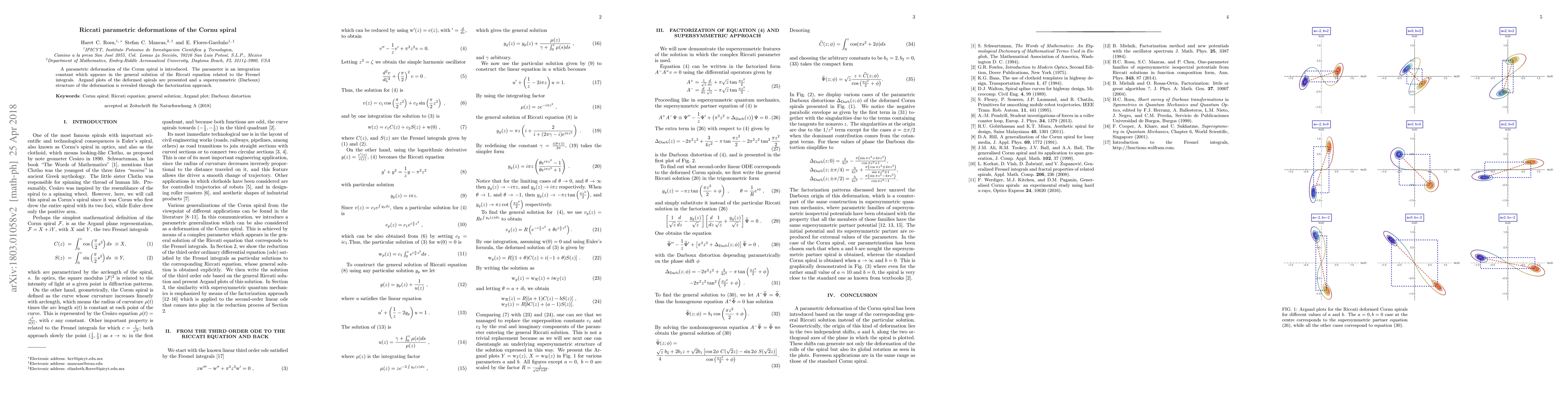 A parametric deformation of the Cornu spiral is introduced. The parameter is an integration constant which appears in the general solution of the Riccati equation related to the Fresnel integrals. Argand plots of the deformed spirals are presented and a supersymmetric (Darboux) structure of the deformation is revealed through the factorization approach.
