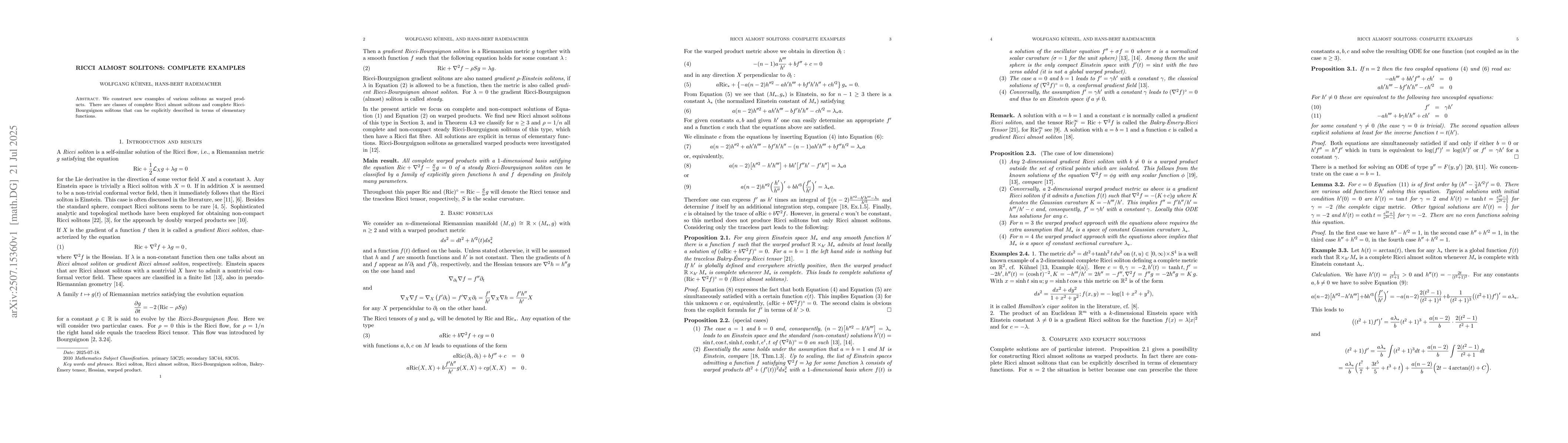 We construct new examples of various solitons as warped products. There are classes of complete Ricci almost solitons and complete Ricci-Bourguignon solitons that can be explicitly described in terms of elementary functions.