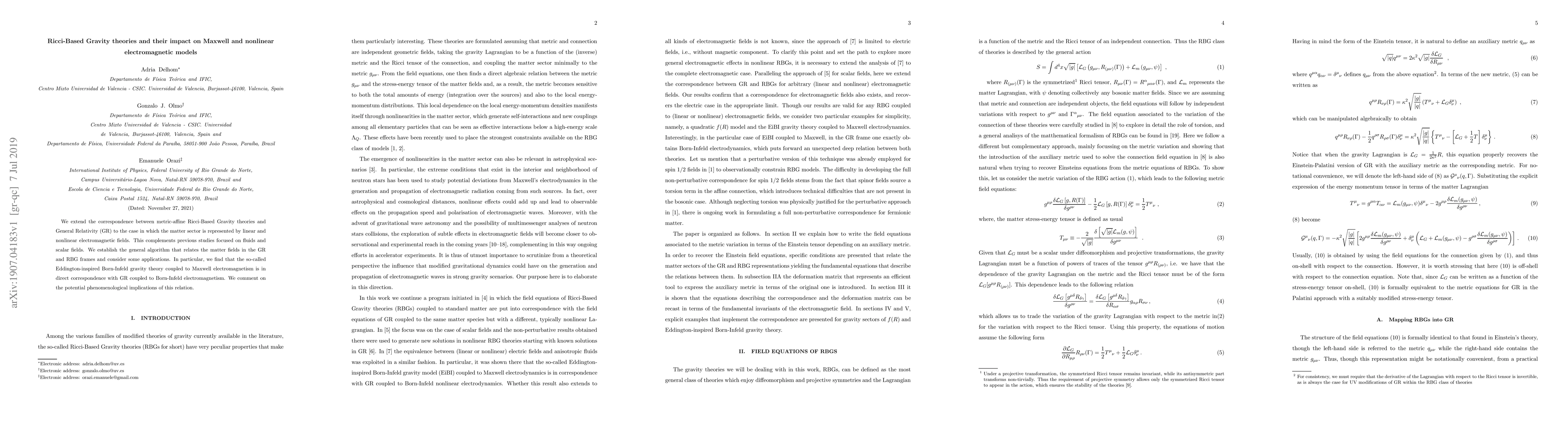 Researchers extend a correspondence between Ricci-Based Gravity theories and General Relativity to electromagnetic fields, finding direct relations with certain gravity-electromagnetism theories.