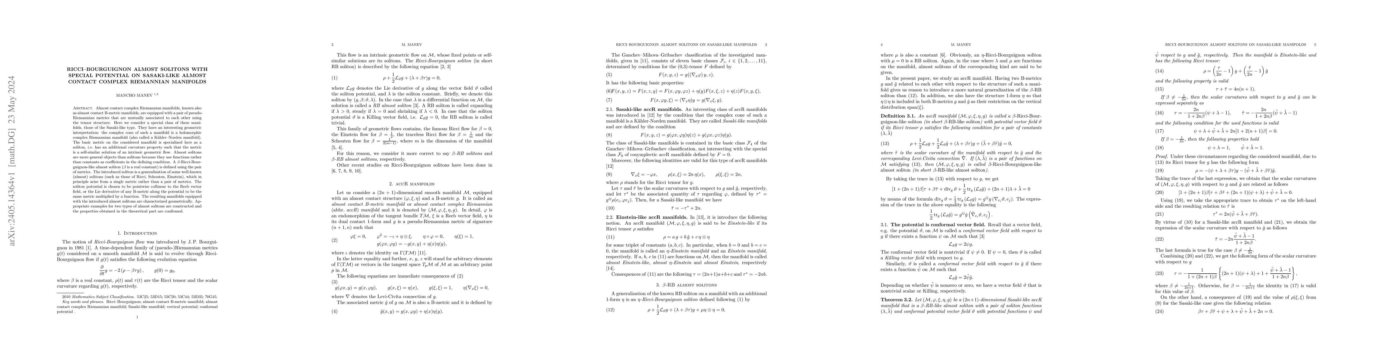 Almost contact complex Riemannian manifolds, also known as almost contact B-metric manifolds, are equipped with a pair of pseudo-Riemannian metrics that are mutually associated with each other using the tensor structure. Here we consider a special class of these manifolds, those of the Sasaki-like type. They have an interesting geometric interpretation: the complex cone of such a manifold is a holomorphic complex Riemannian manifold (also called a K\"ahler-Norden manifold). The basic metric on the considered manifold is specialized here as a soliton, i.e. has an additional curvature property such that the metric is a self-similar solution of an intrinsic geometric flow. Almost solitons are more general objects than solitons because they use functions rather than constants as coefficients in the defining condition. A $\beta$-Ricci-Bourguignon-like almost soliton ($\beta$ is a real constant) is defined using the pair of metrics. The introduced soliton is a generalization of some well-known (almost) solitons (such as those of Ricci, Schouten, and Einstein), which in principle arise from a single metric rather than a pair of metrics. The soliton potential is chosen to be pointwise collinear to the Reeb vector field, or the Lie derivative of any B-metric along the potential to be the same metric multiplied by a function. The resulting manifolds equipped with the introduced almost solitons are characterized geometrically. Appropriate examples for two types of almost solitons are constructed and the properties obtained in the theoretical part are confirmed.