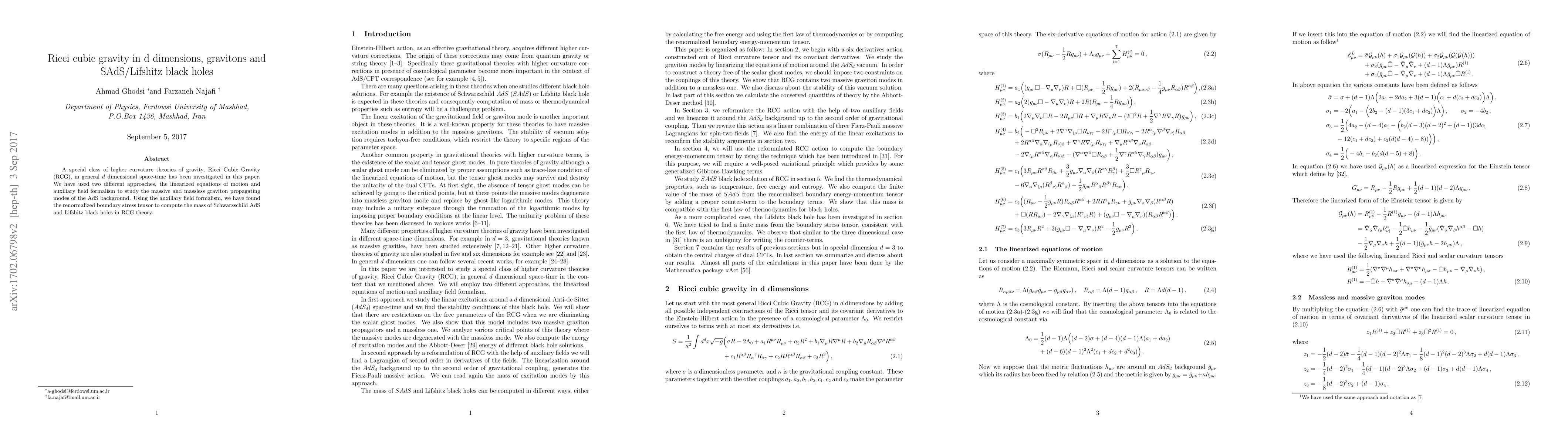 This paper investigates Ricci Cubic Gravity in d-dimensional space-time, employing linearized equations and auxiliary field formalism to study graviton modes in AdS backgrounds. It also computes the mass of Schwarzschild AdS and Lifshitz black holes using renormalized boundary stress tensors in Ricci Cubic Gravity.