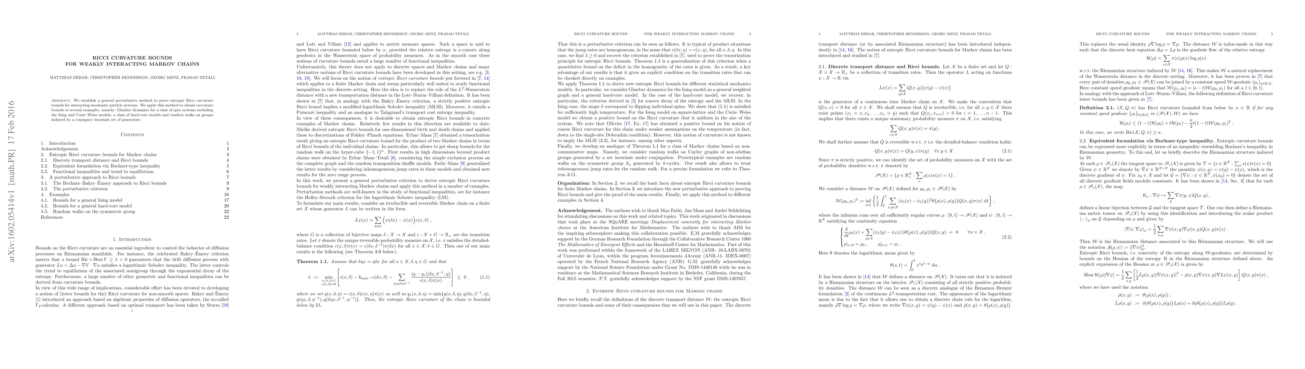 This paper introduces a perturbative technique to demonstrate entropic Ricci curvature bounds for weakly interacting Markov chains, applying it to various models including Ising, Curie-Weiss, hard-core systems, and random walks on groups. The method provides curvature bounds for these stochastic particle systems.