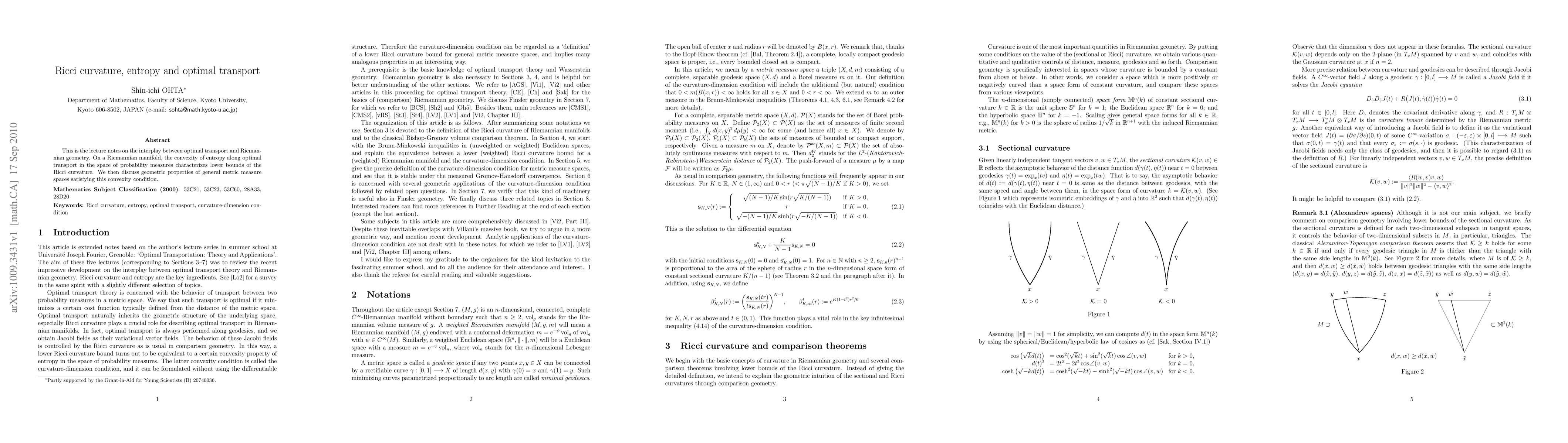 This is the lecture notes on the interplay between optimal transport and Riemannian geometry. On a Riemannian manifold, the convexity of entropy along optimal transport in the space of probability measures characterizes lower bounds of the Ricci curvature. We then discuss geometric properties of general metric measure spaces satisfying this convexity condition.