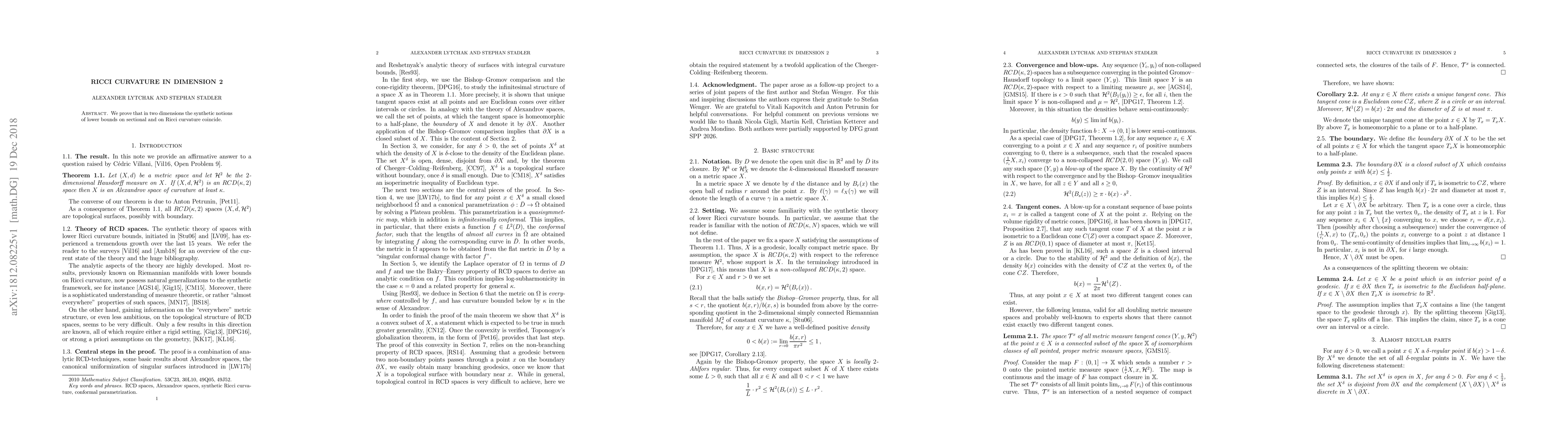 We prove that in two dimensions the synthetic notions of lower bounds on sectional and on Ricci curvature coincide.